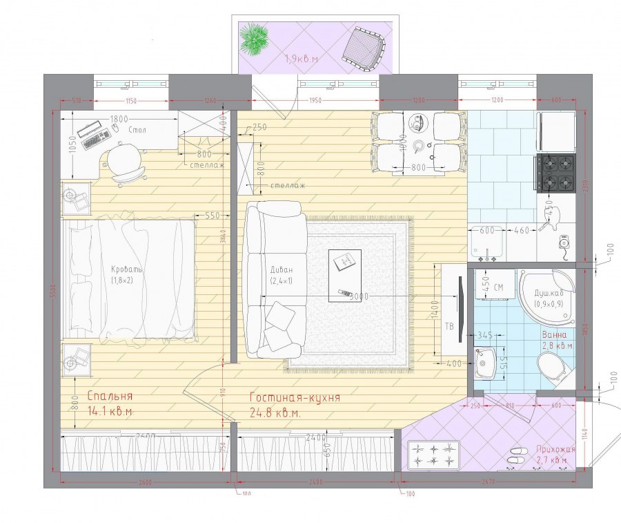 Перепланировка двухкомнатной хрущевки 44 кв.м