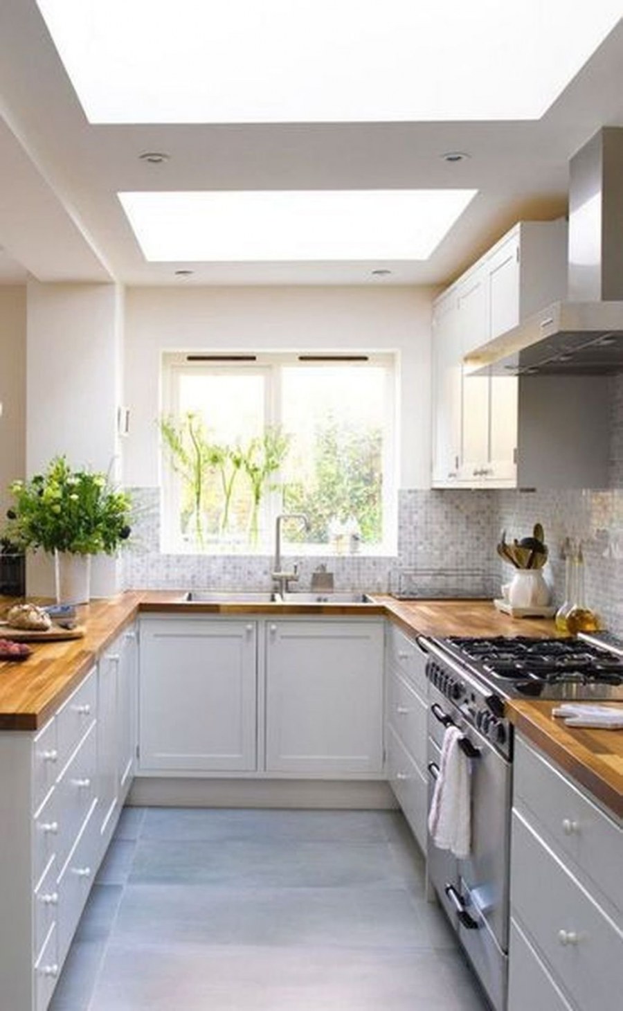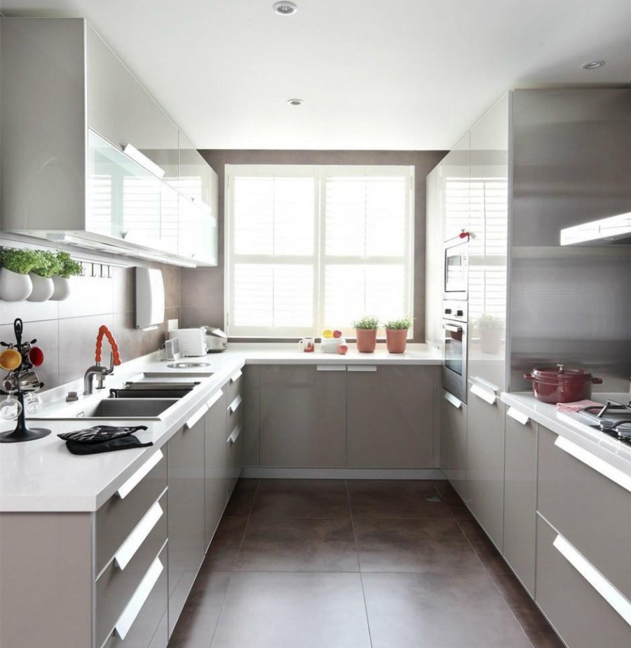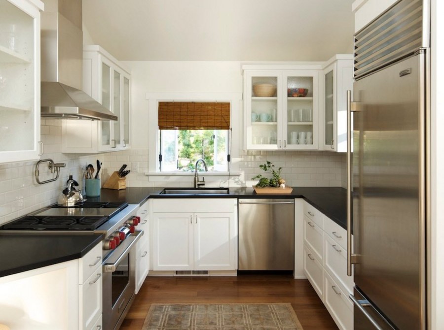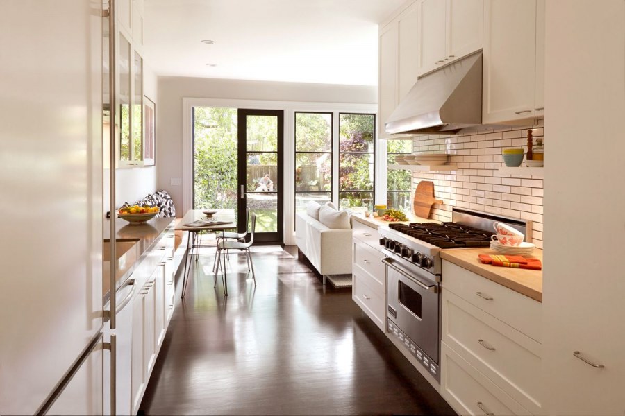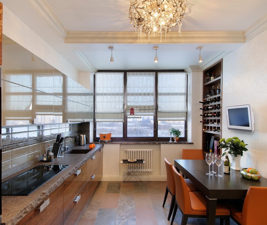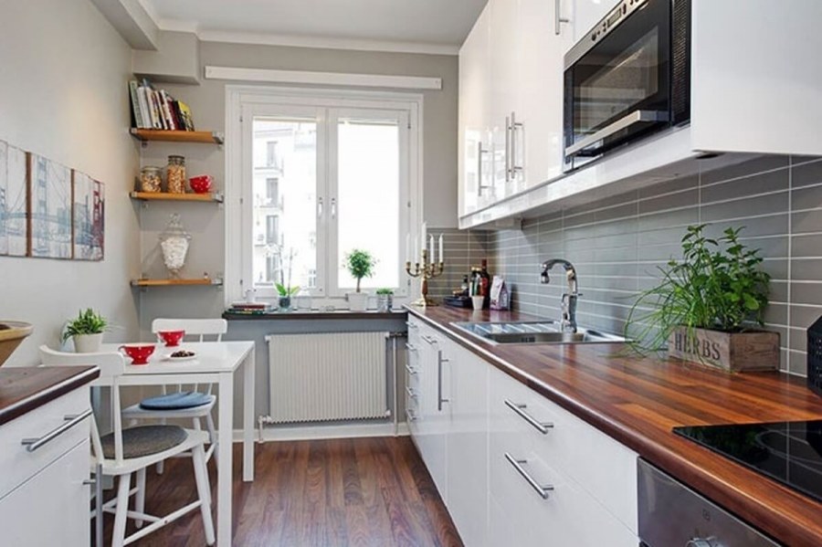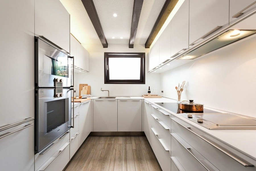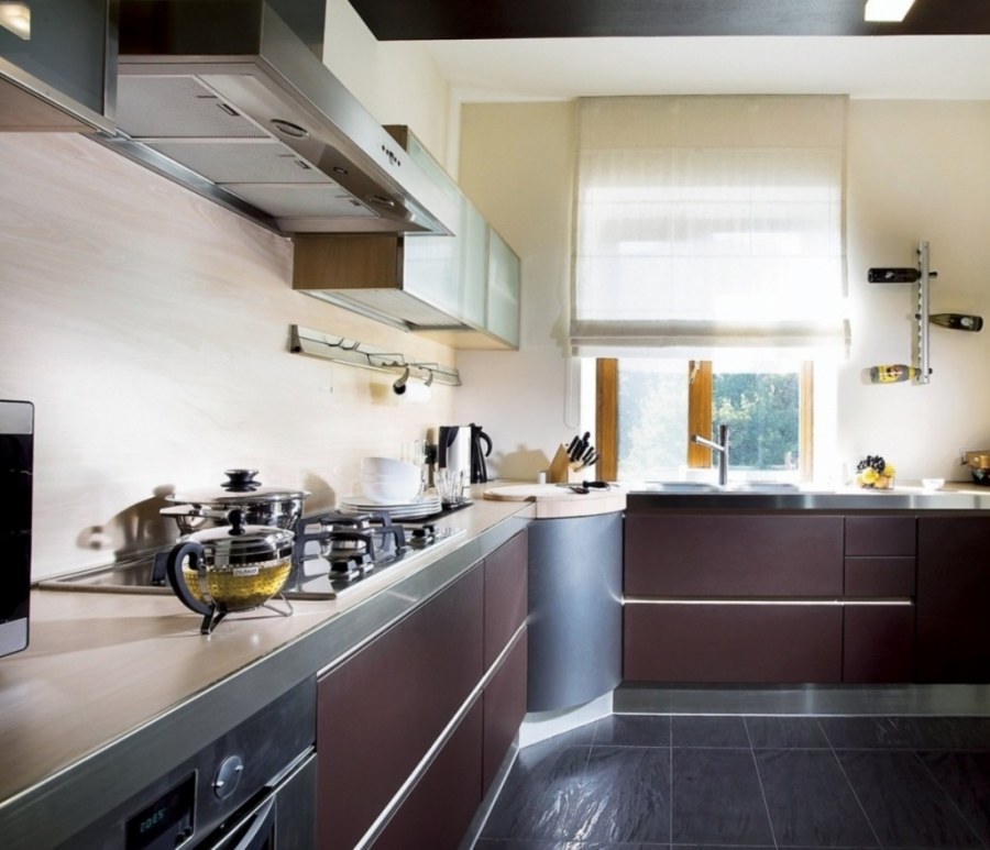 Современный дизайн кухни прямоугольной с окном (72 фото)