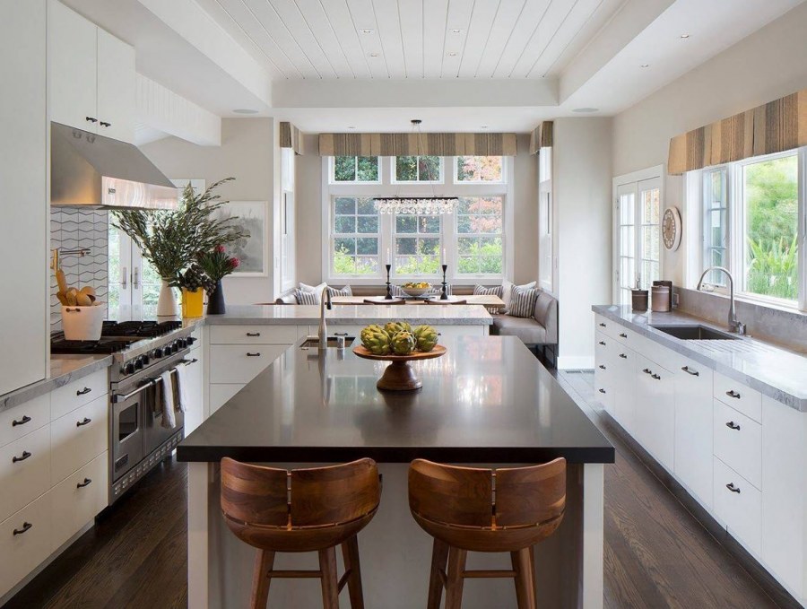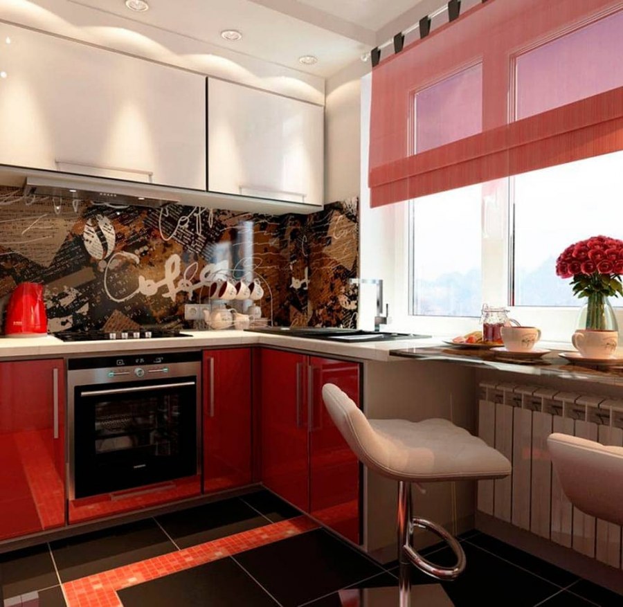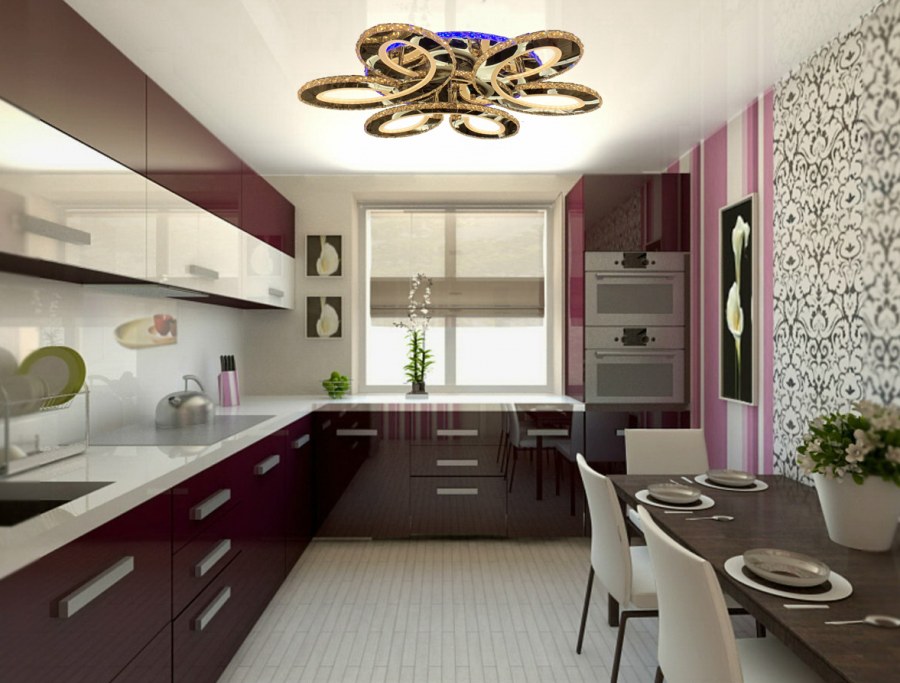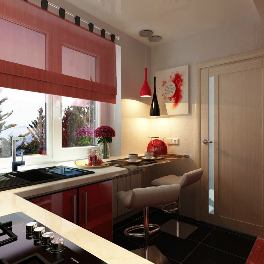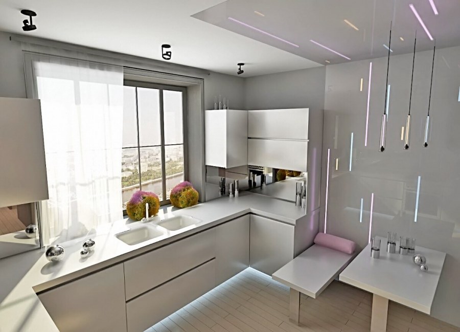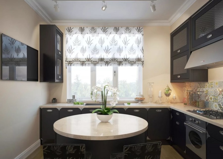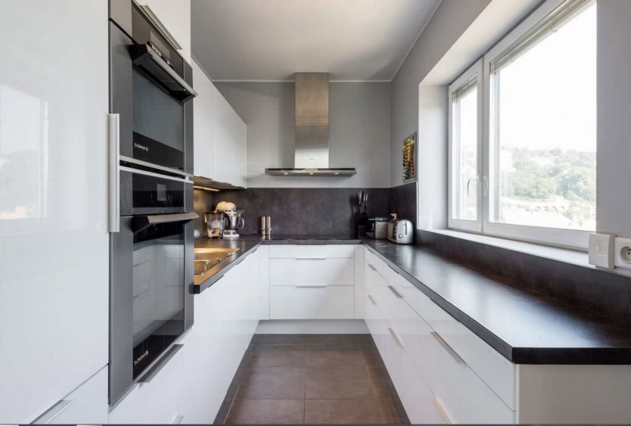 Современный дизайн кухни прямоугольной с окном (72 фото)