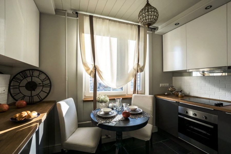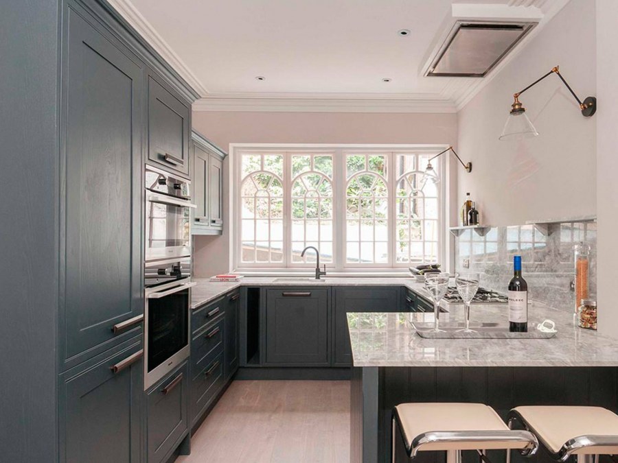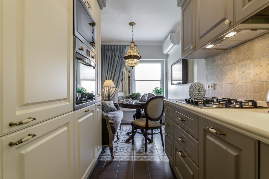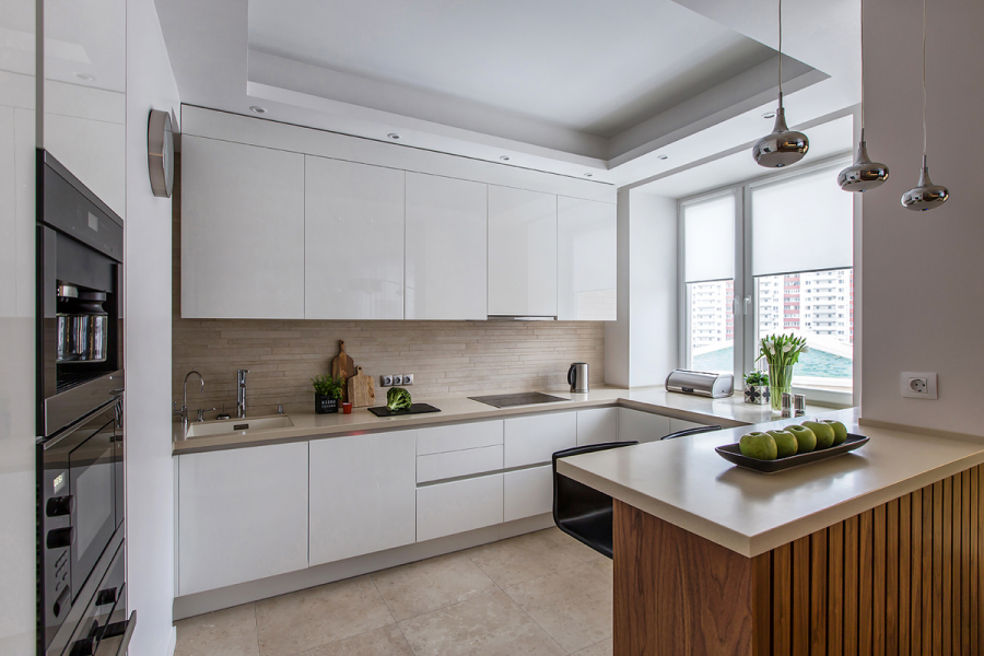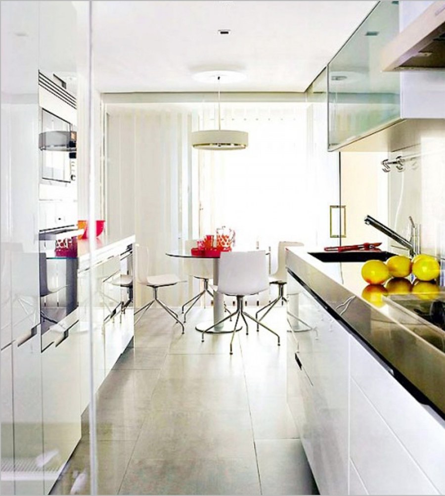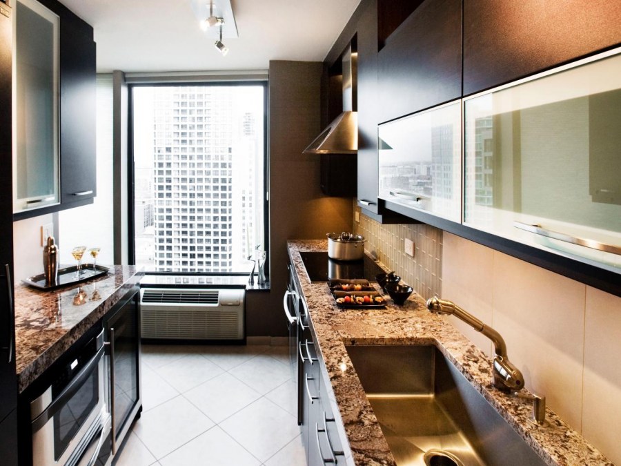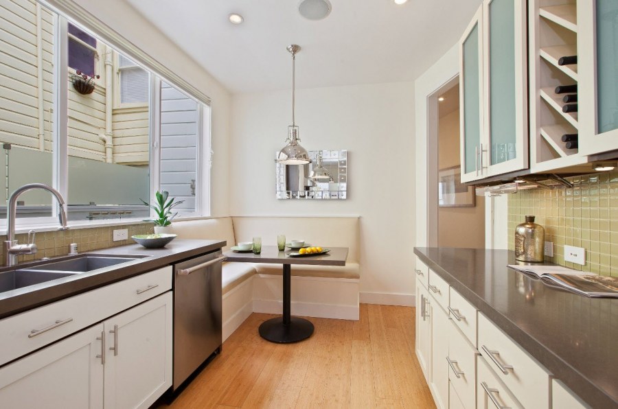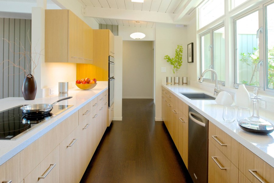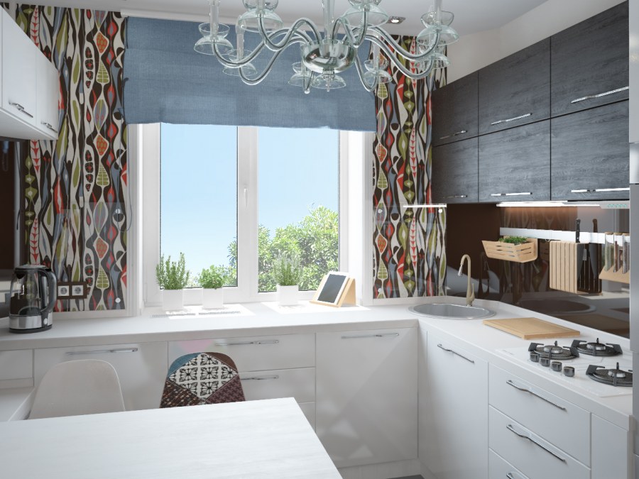Современный дизайн кухни прямоугольной с окном (72 фото)