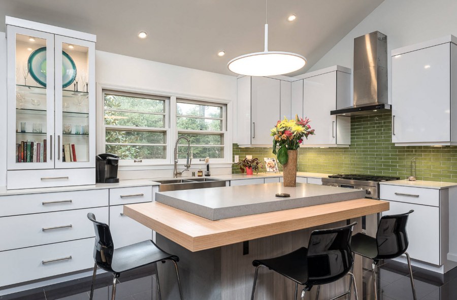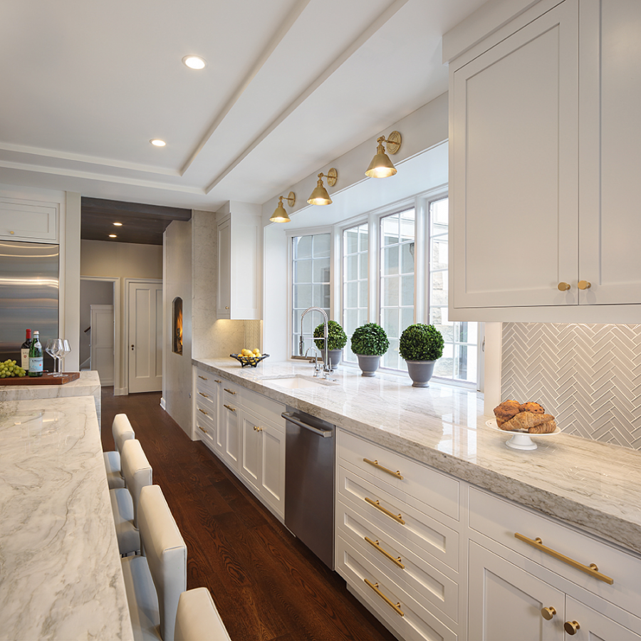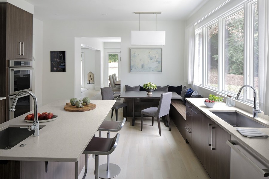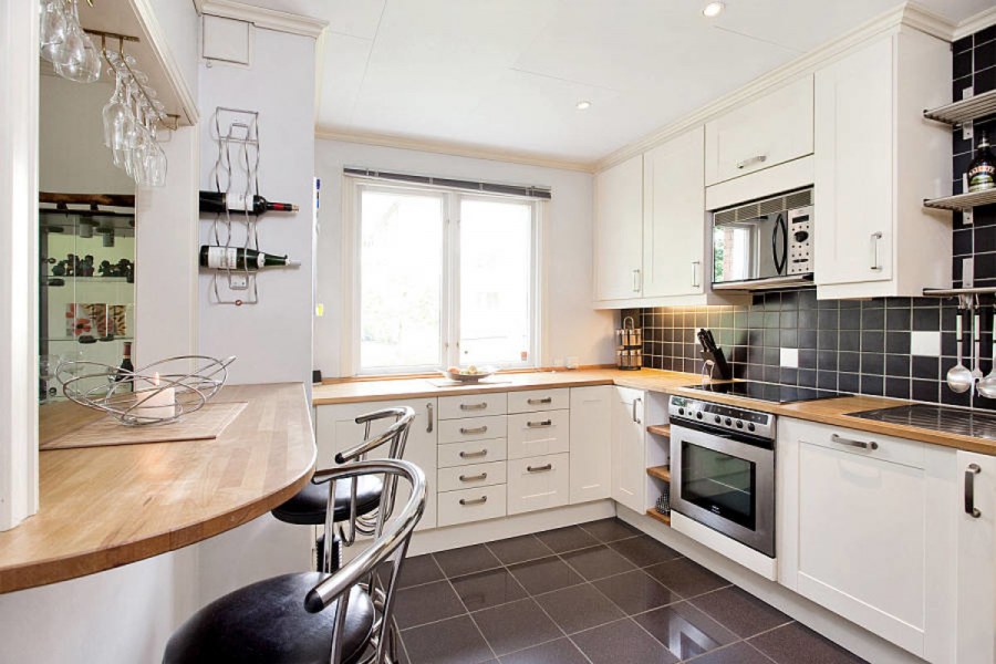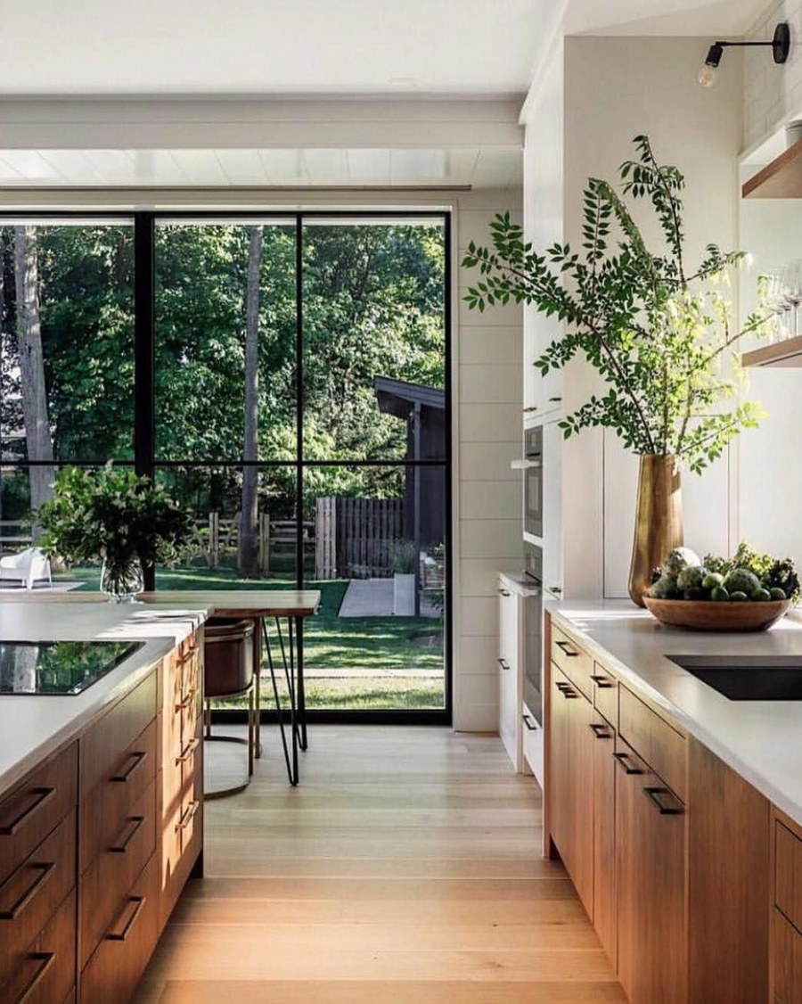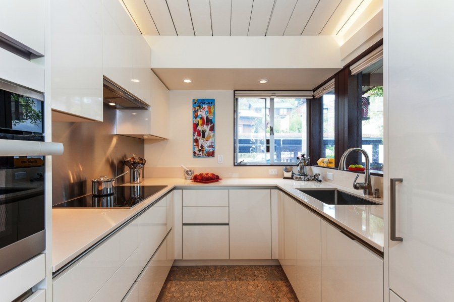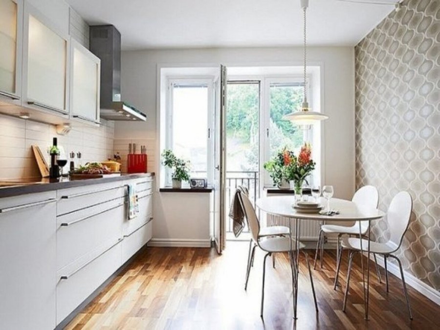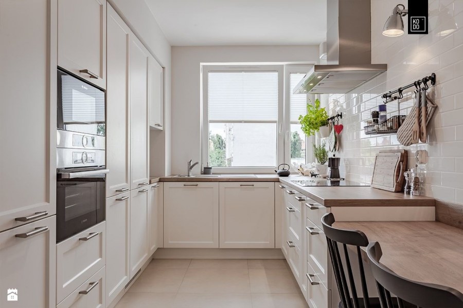 Современный дизайн кухни прямоугольной с окном (72 фото)