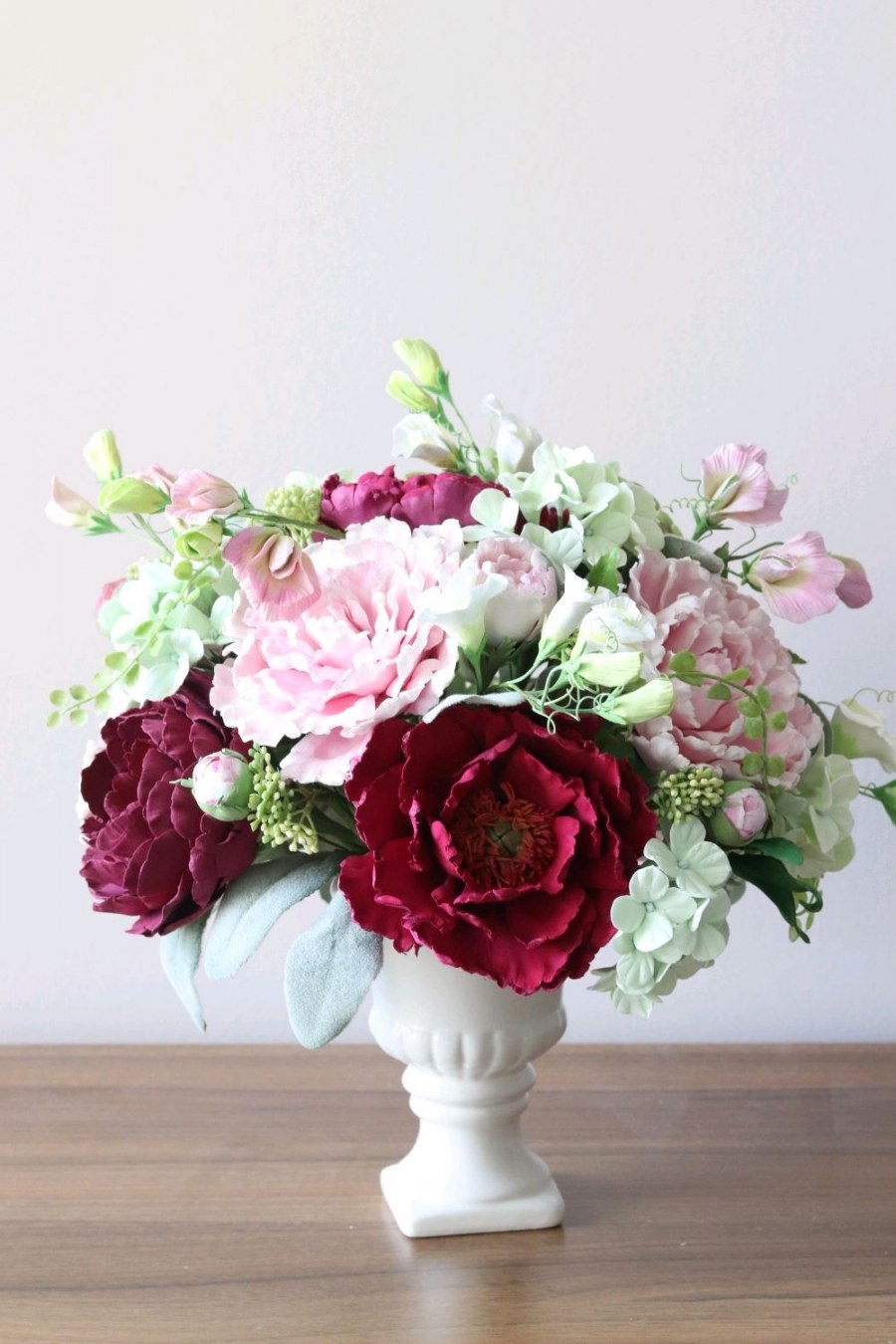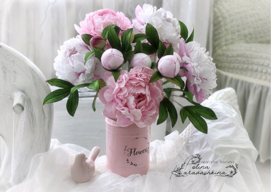 Букеты из искусственных пионов бежевых с синеватой зеленью