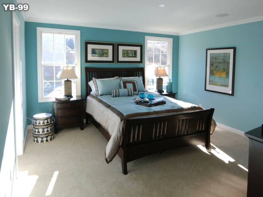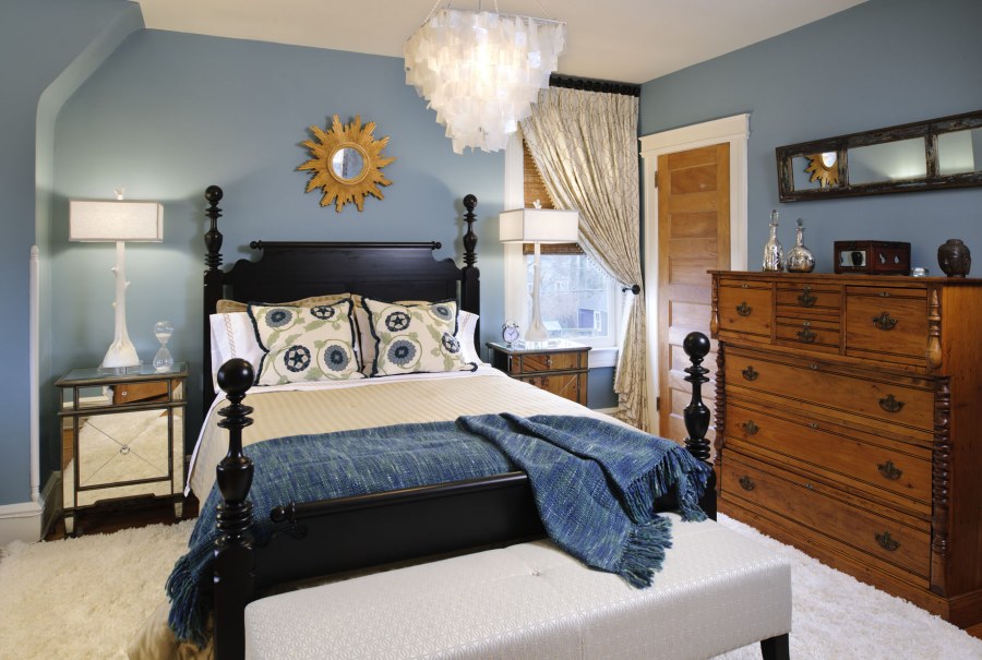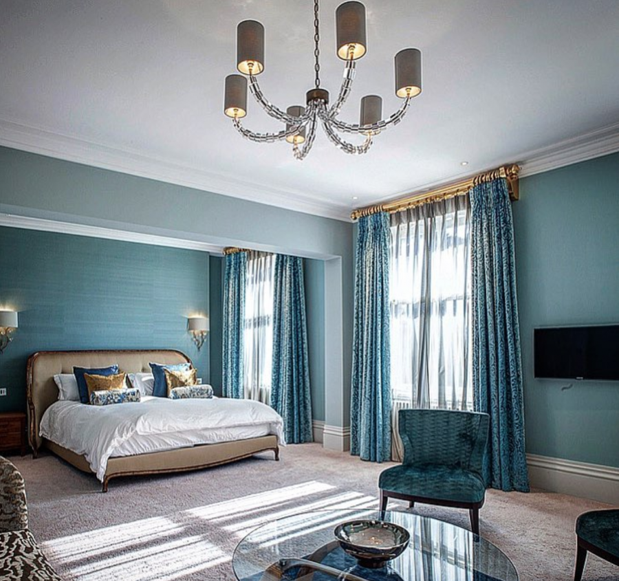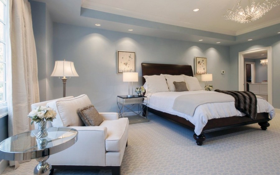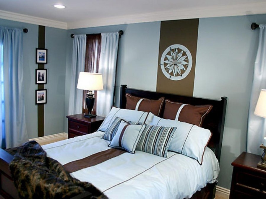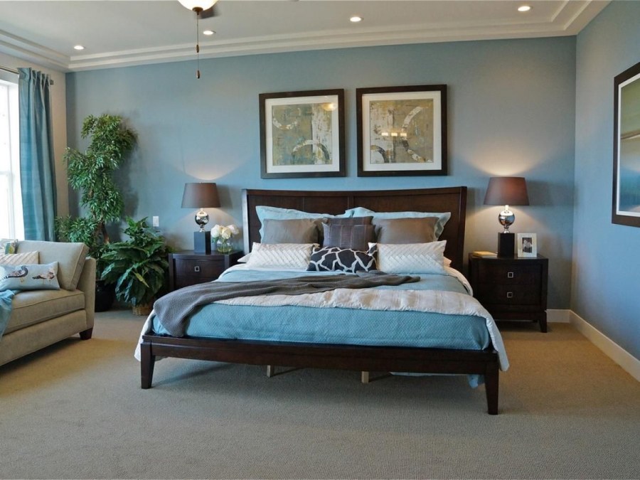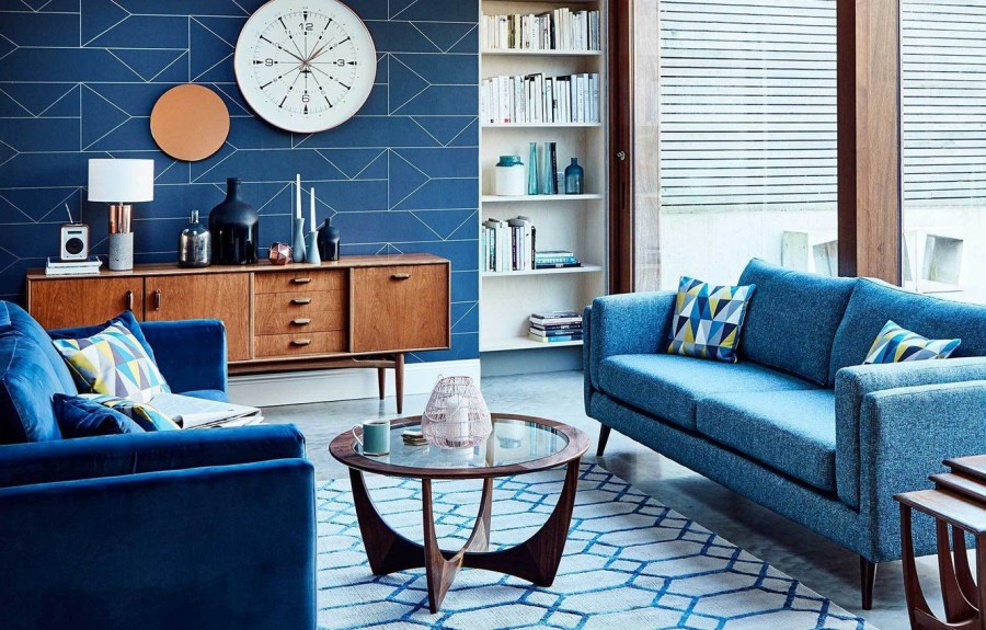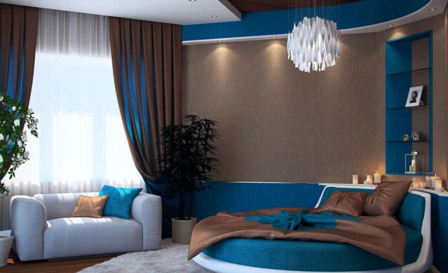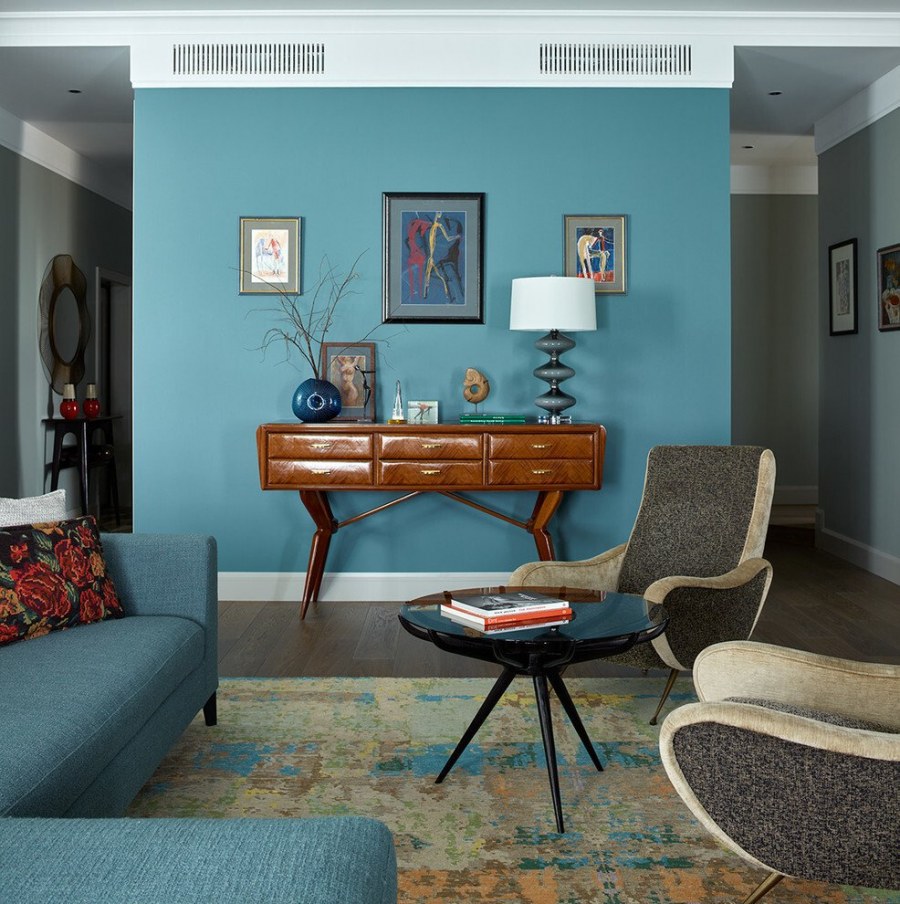 Голубые обои и коричневая мебель в интерьере (75 фото)