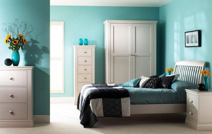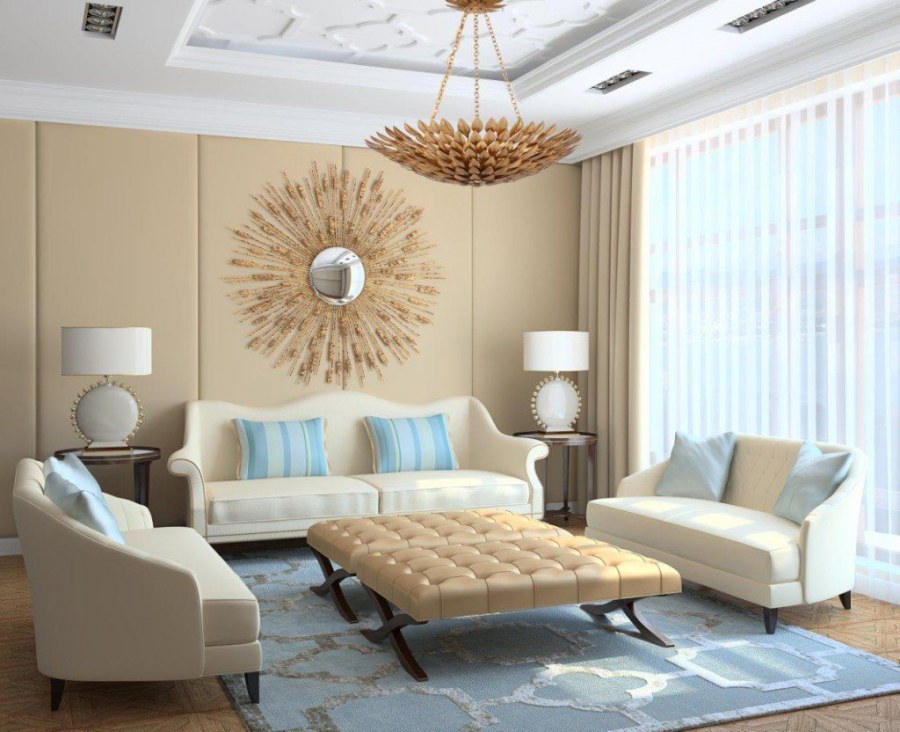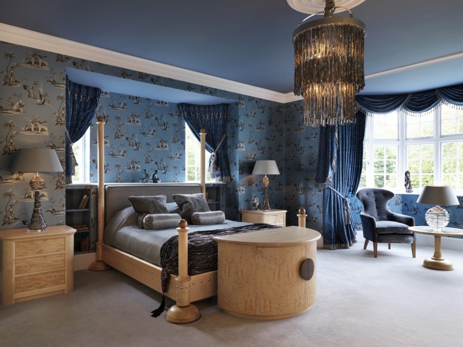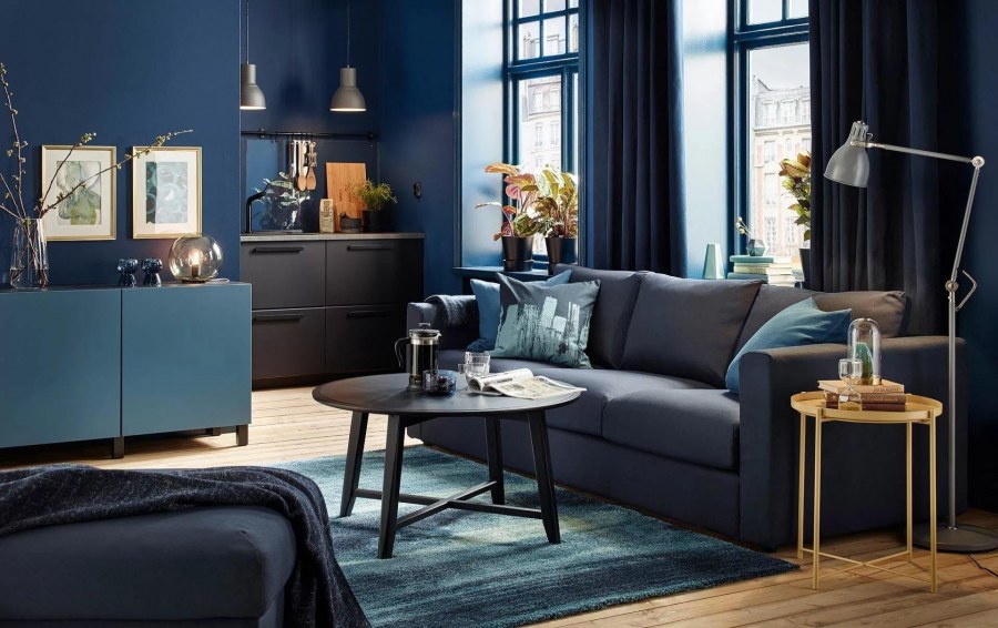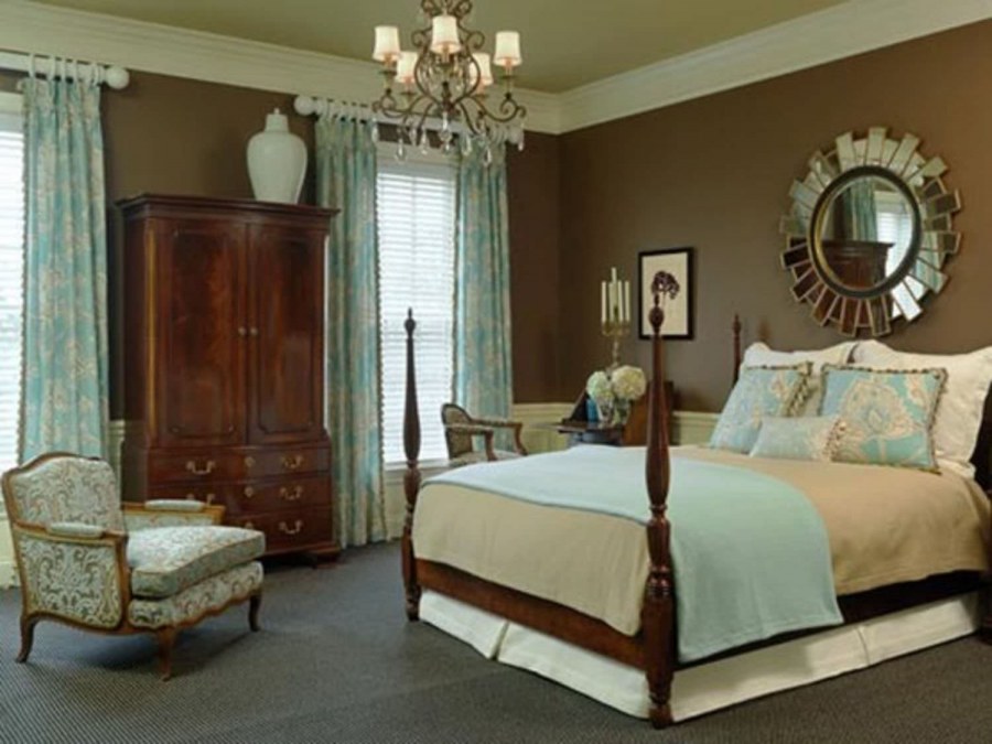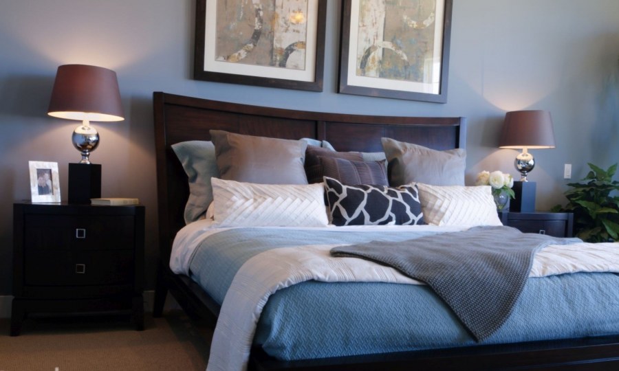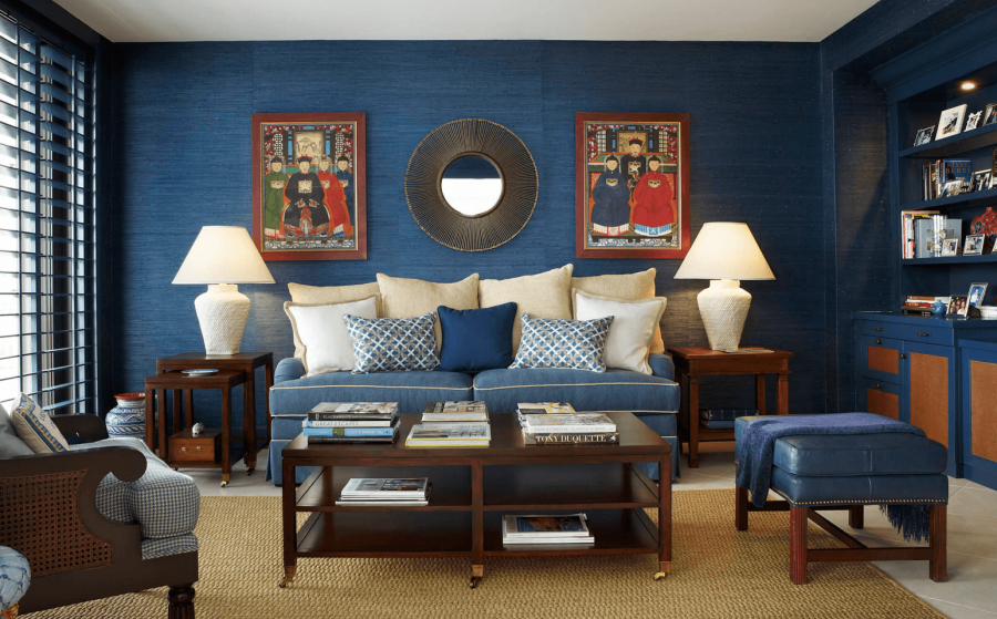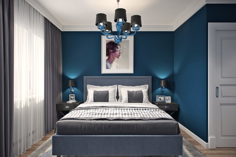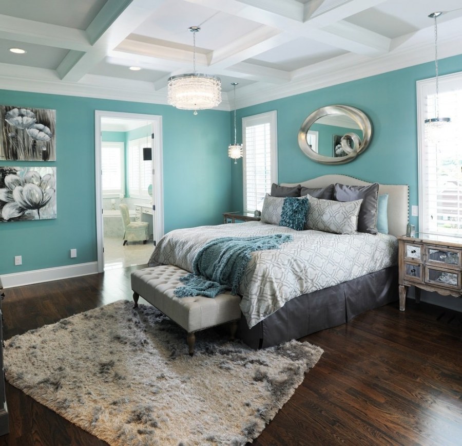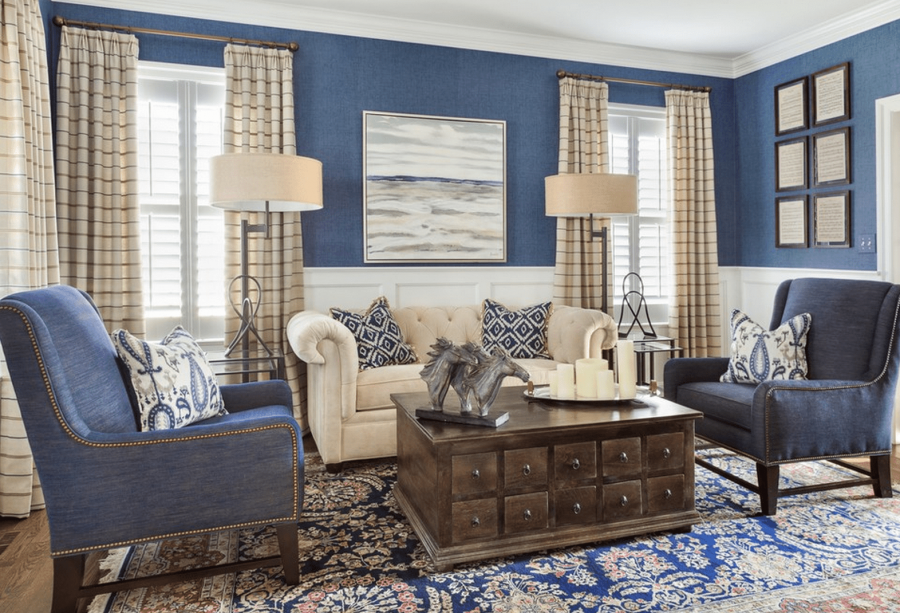 Голубые обои и коричневая мебель в интерьере (75 фото)