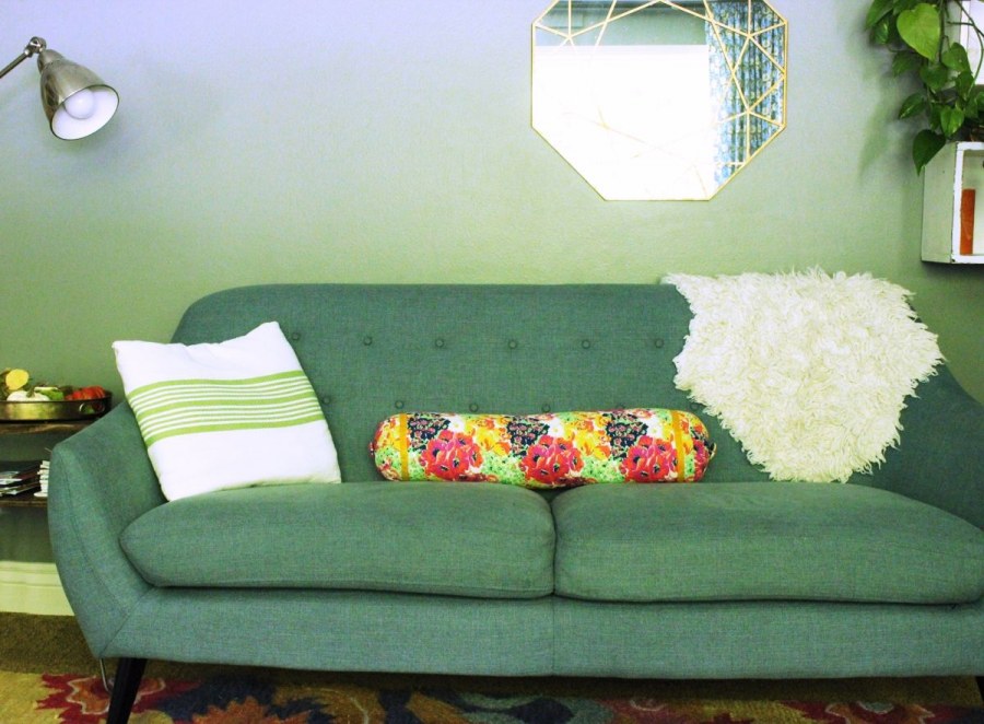 Зелёный диван и жёлтые оранжевые подушки в интерьере