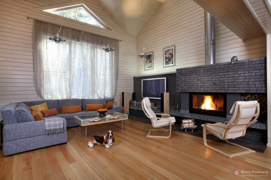 Интерьер гостиной на даче с камином