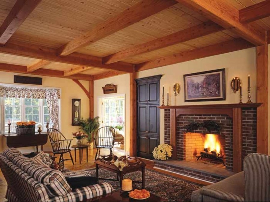 Гостиные с камином в деревянном доме