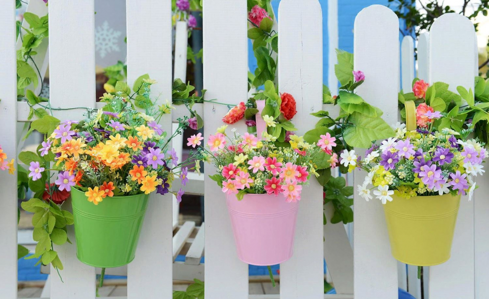 Горшки с цветами на заборе