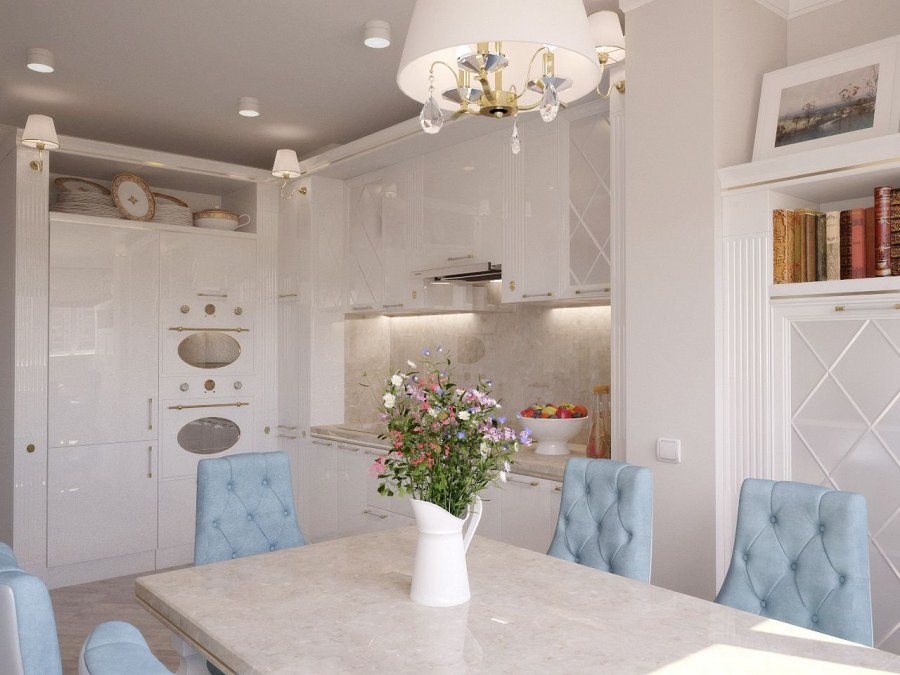 Кухня гостиная в пастельных тонах с яркими акцентами