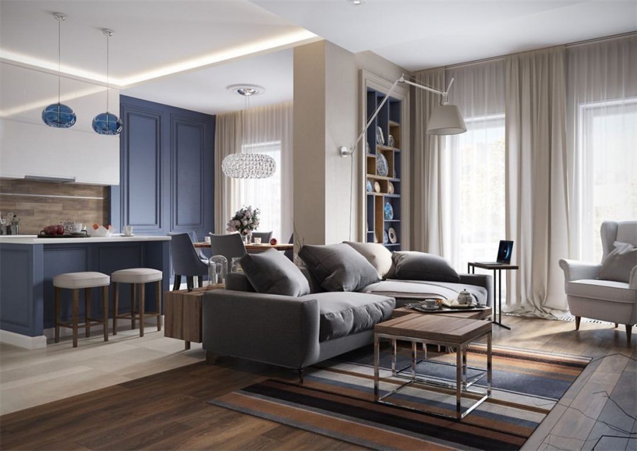 Кухня гостиная в серо голубых тонах