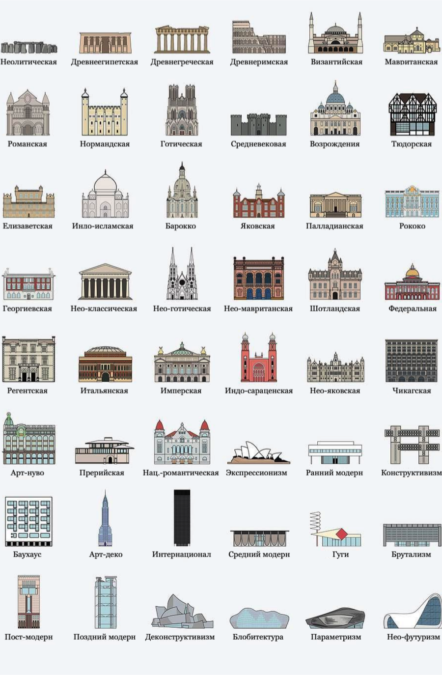 Характерные элементы различных архитектурных стилей