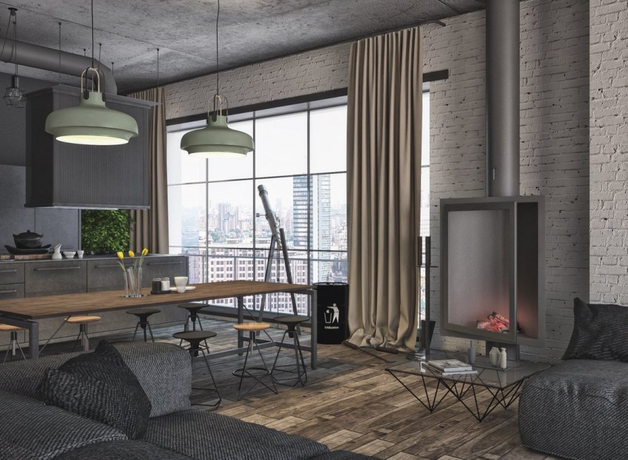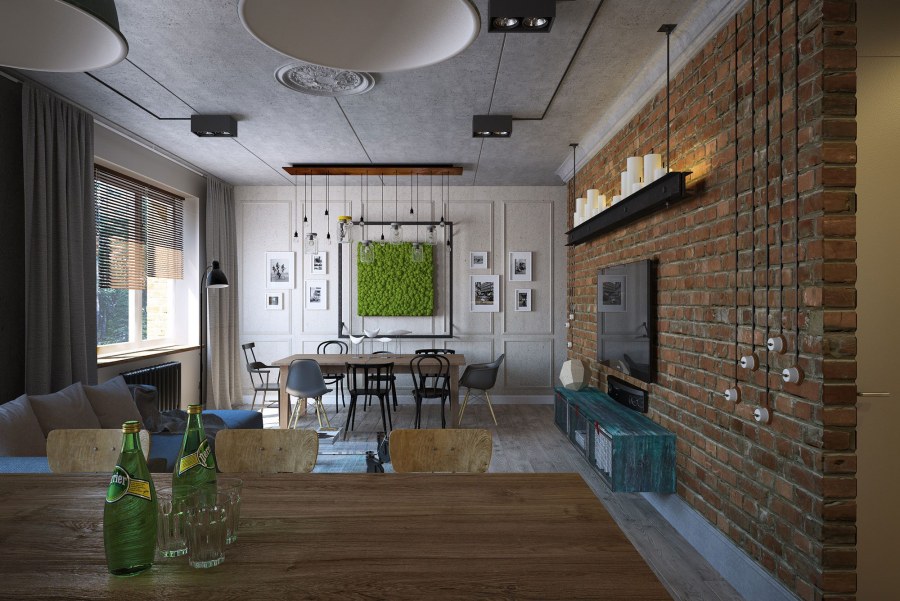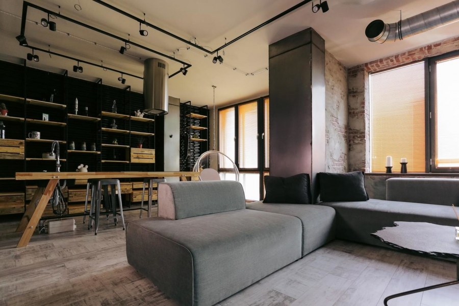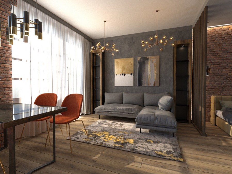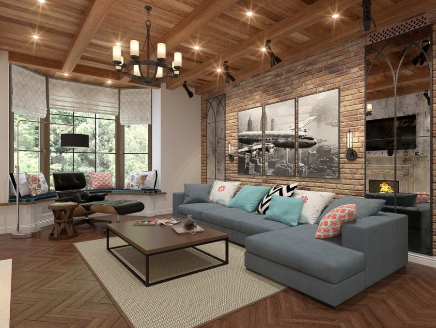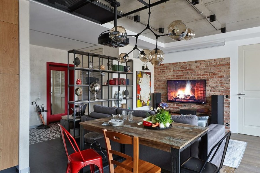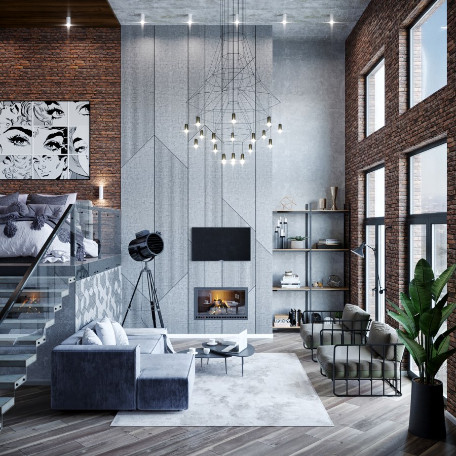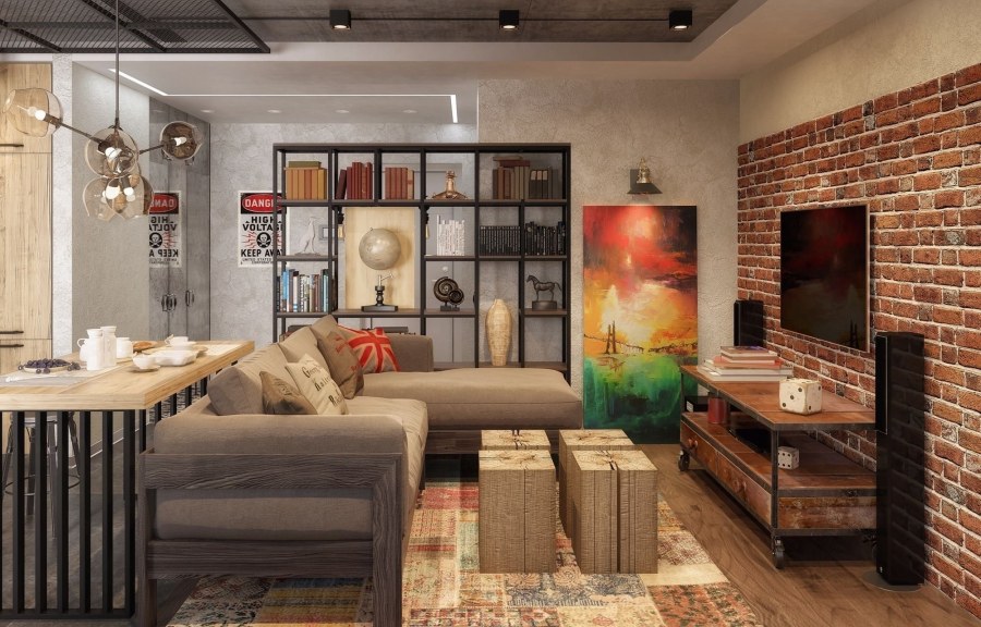 Люстра в интерьере гостиной 12 кв.м в стиле лофт