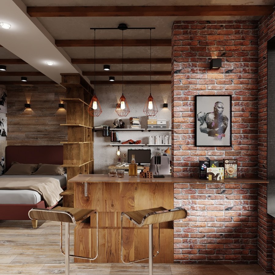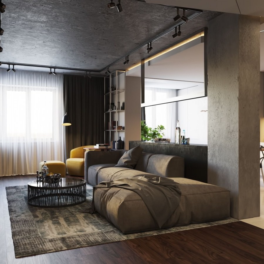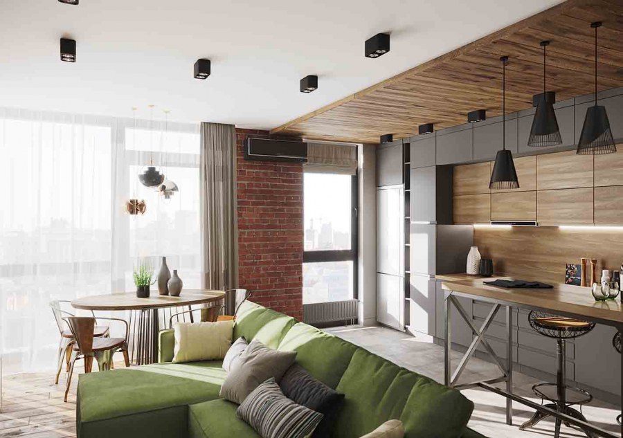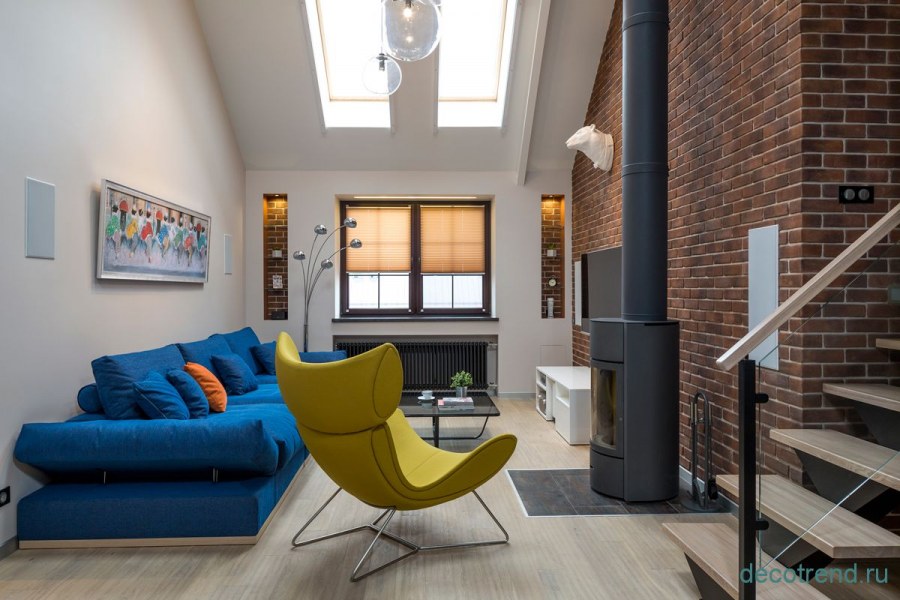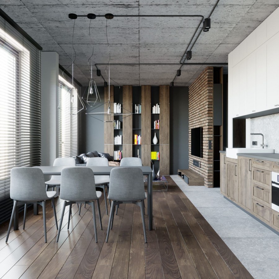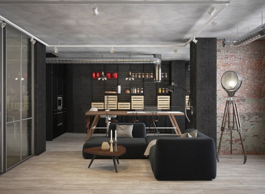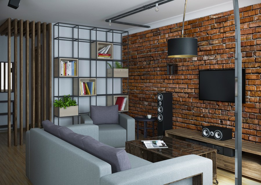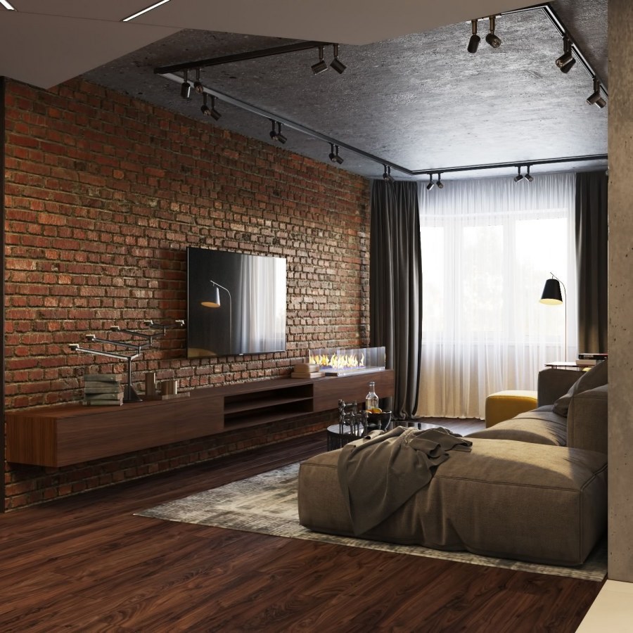 Люстра в интерьере гостиной 12 кв.м в стиле лофт