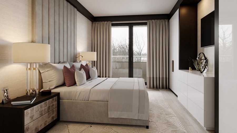 Спальня в пастельных тонах с темной мебелью