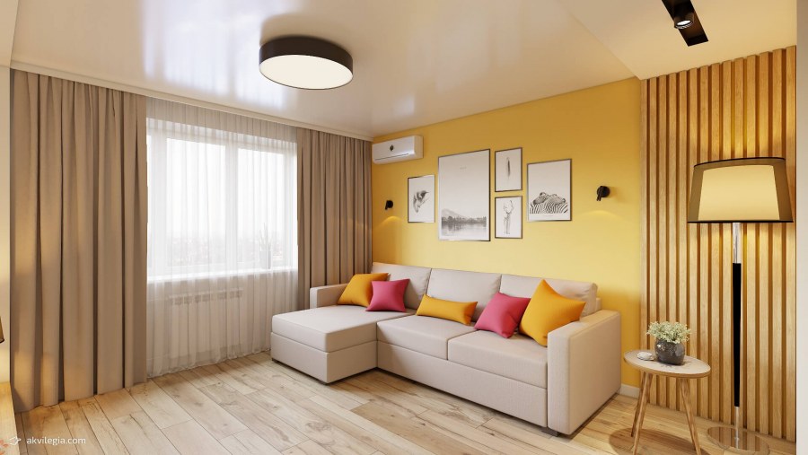 Горчичный диван в интерьере гостиной