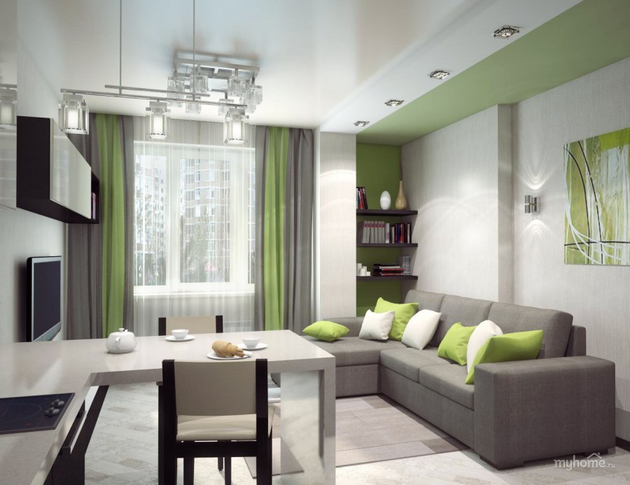 Серо зеленая кухня гостиная