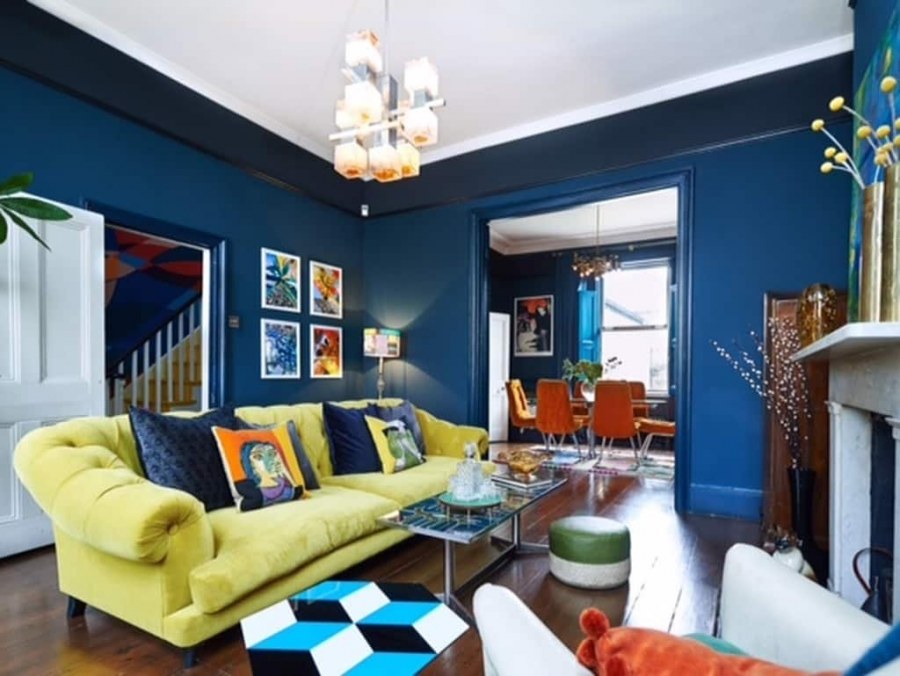 Гостиная с синей стеной