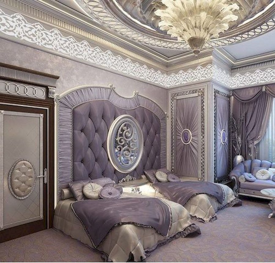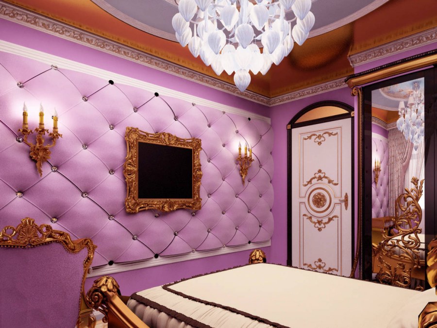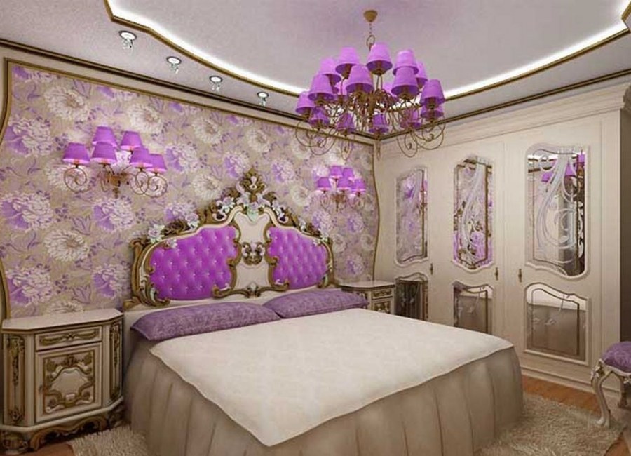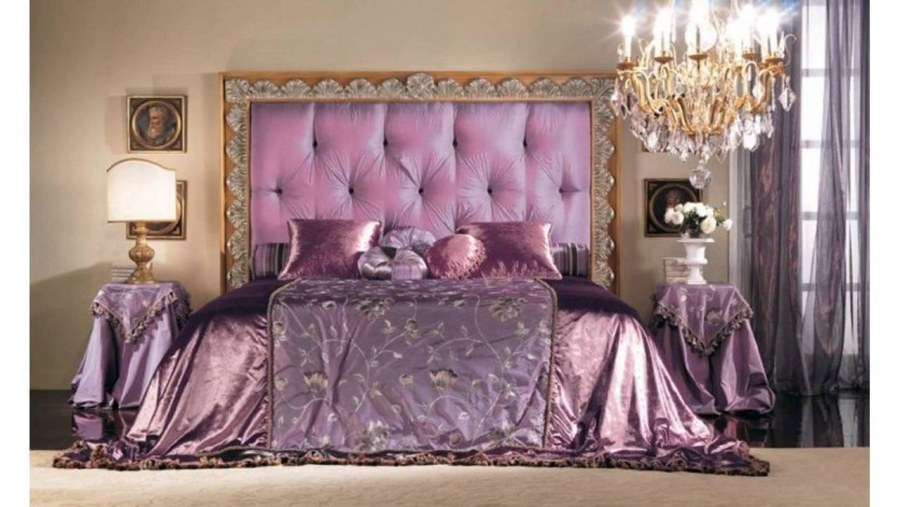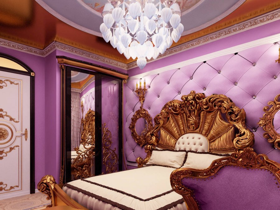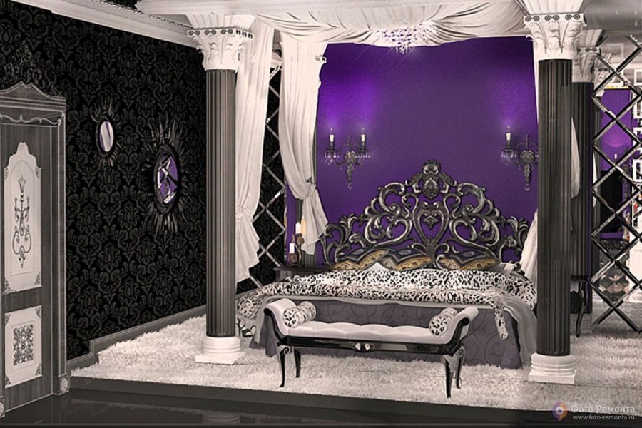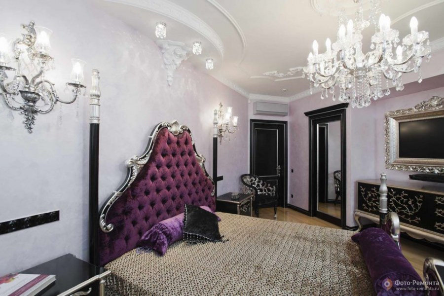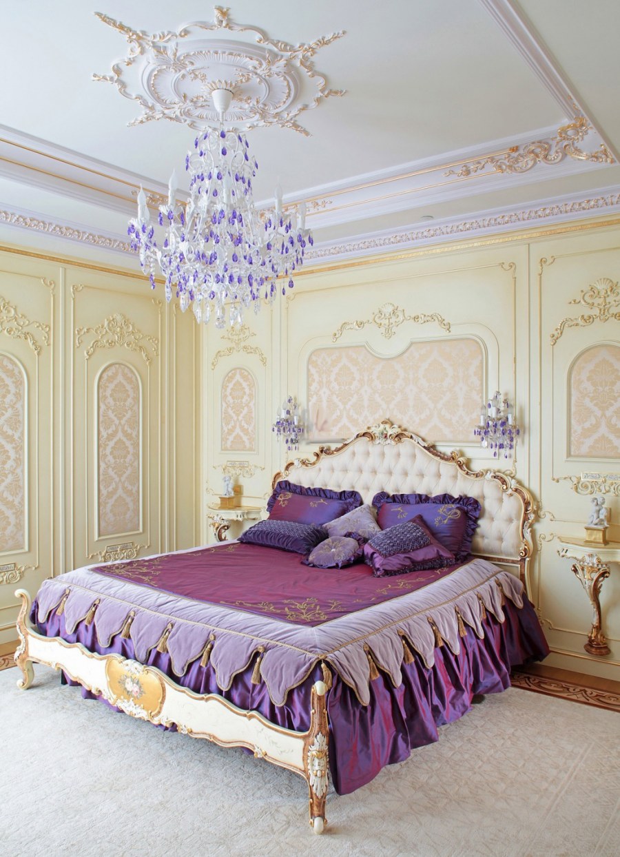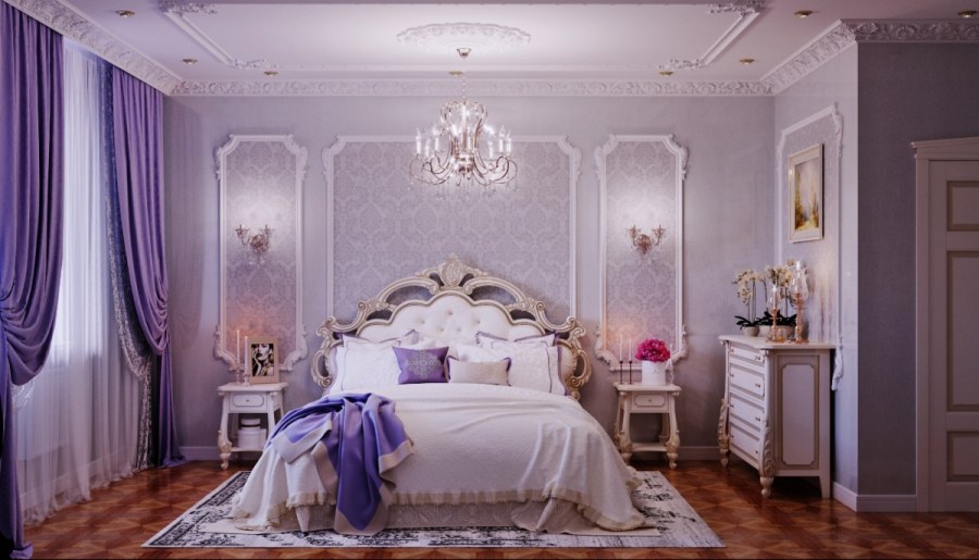 Интерьер спальни в сиренево белом цвете в стиле Барокко