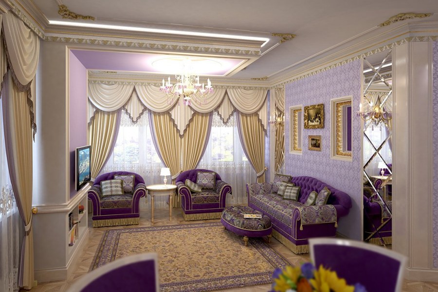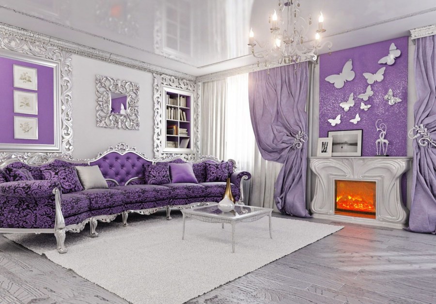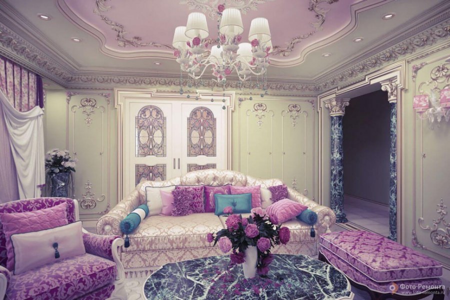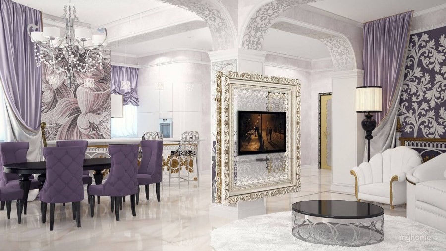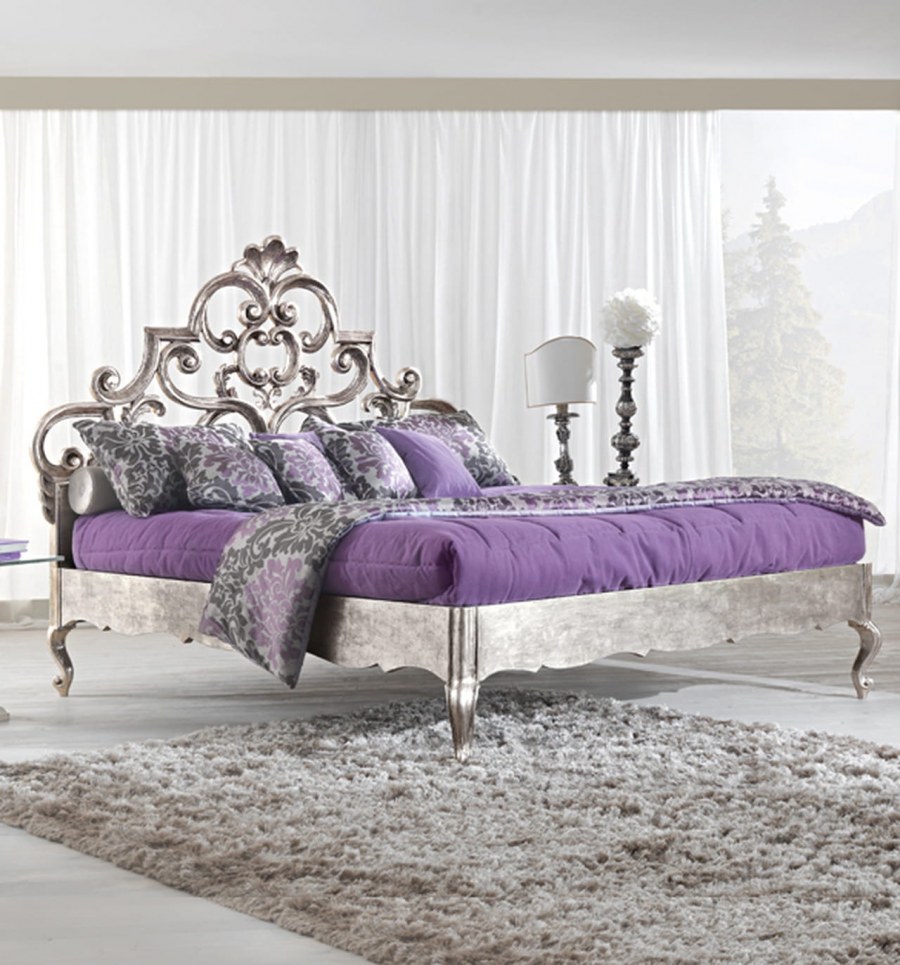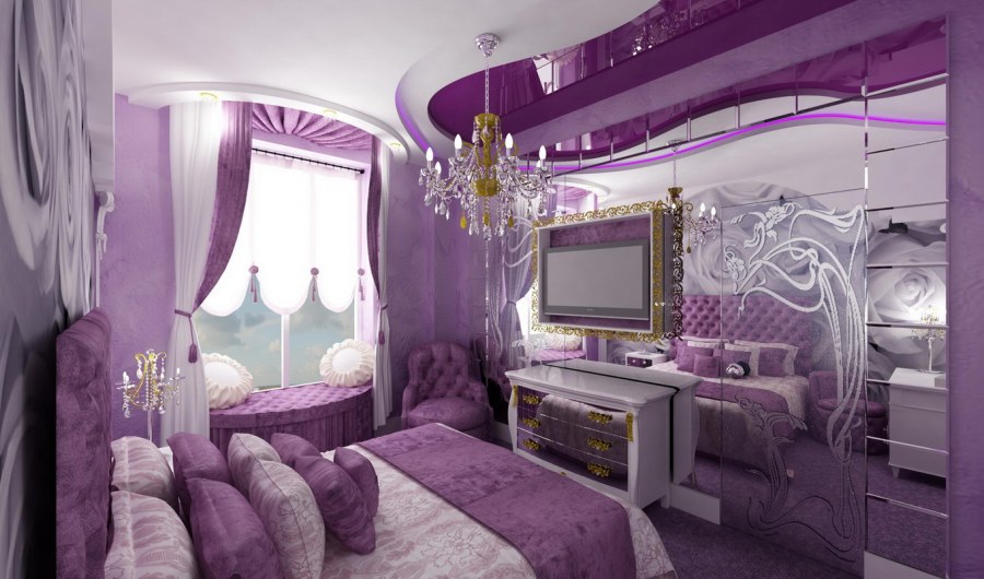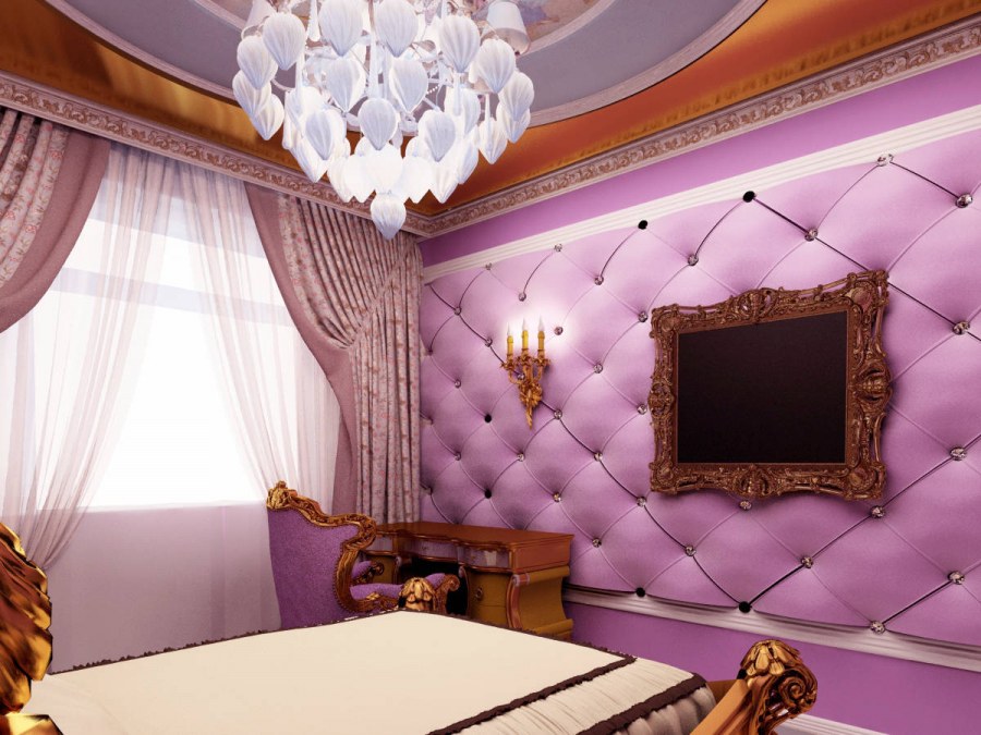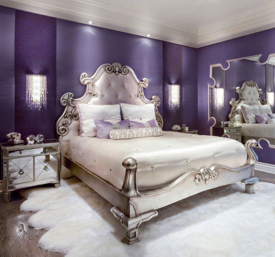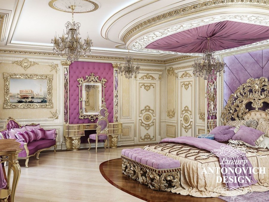 Интерьер спальни в сиренево белом цвете в стиле Барокко