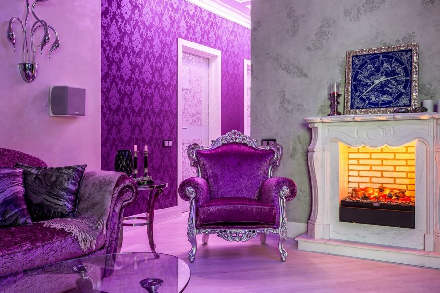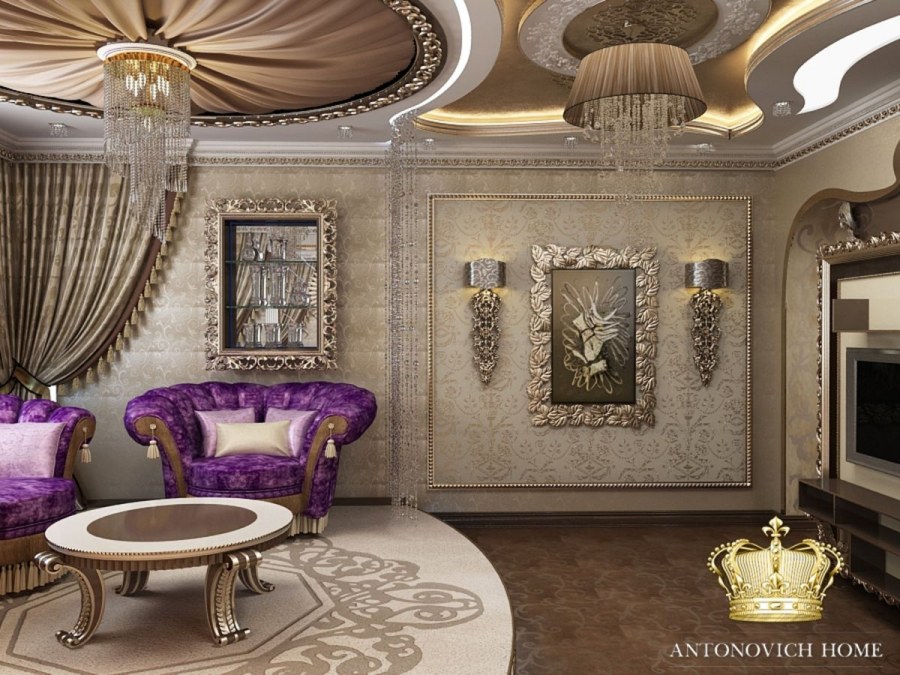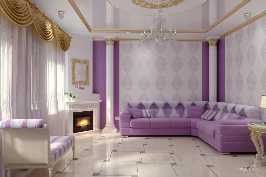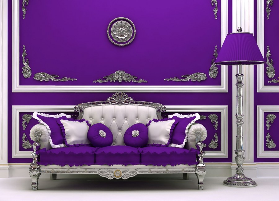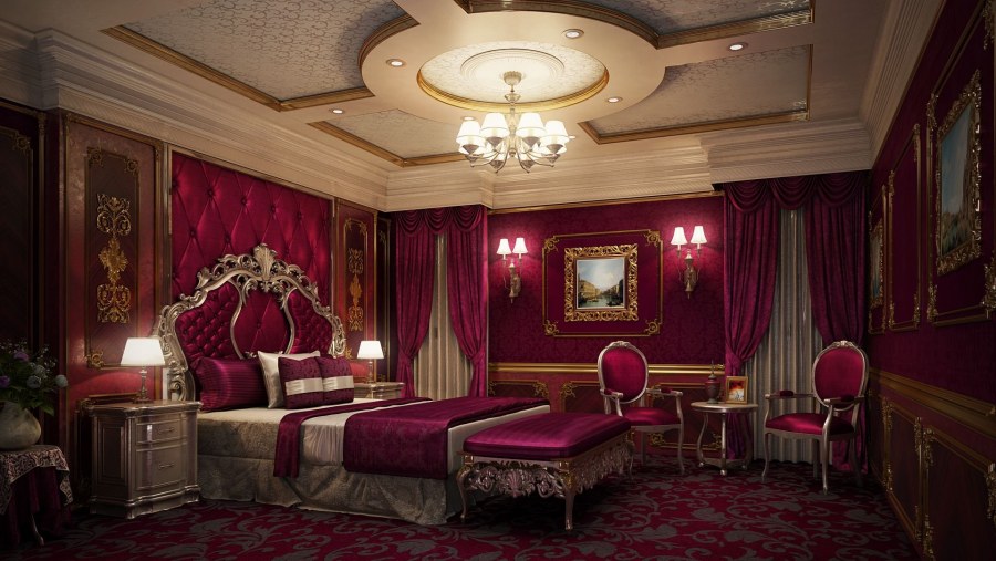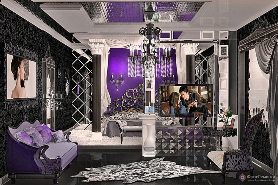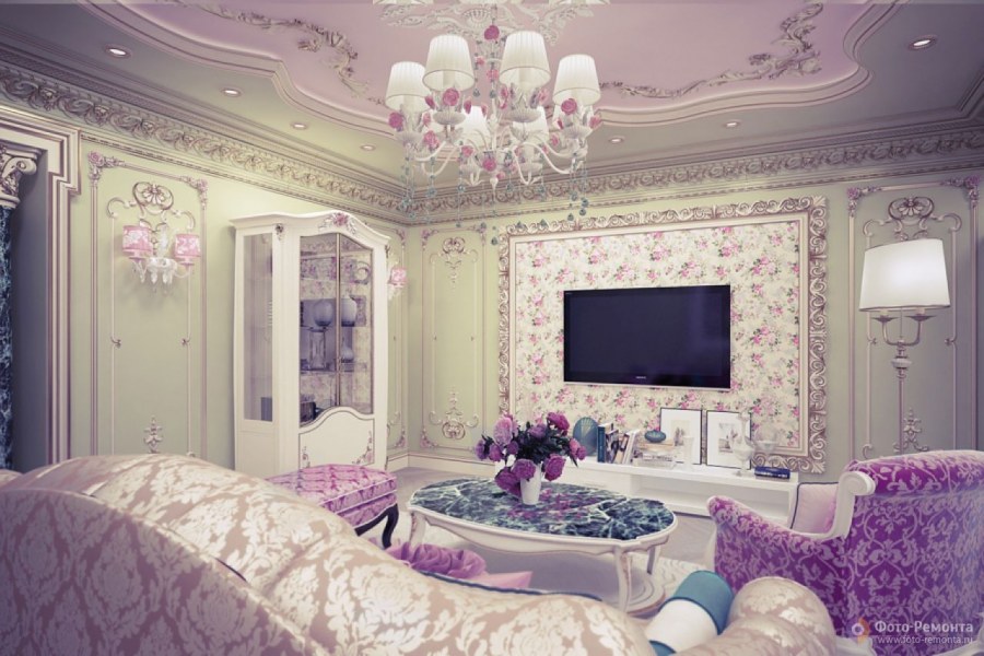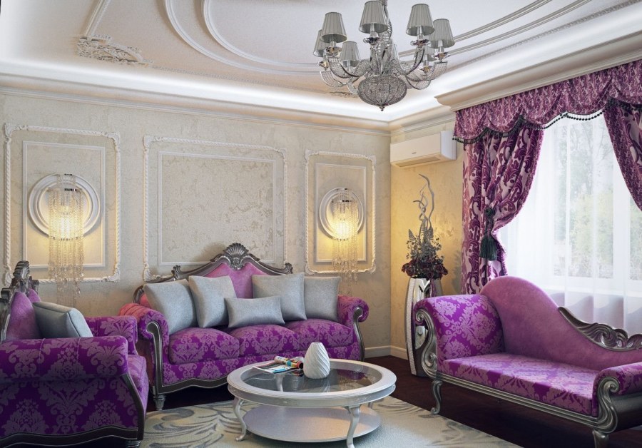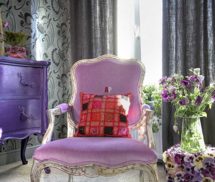 Интерьер спальни в сиренево белом цвете в стиле Барокко