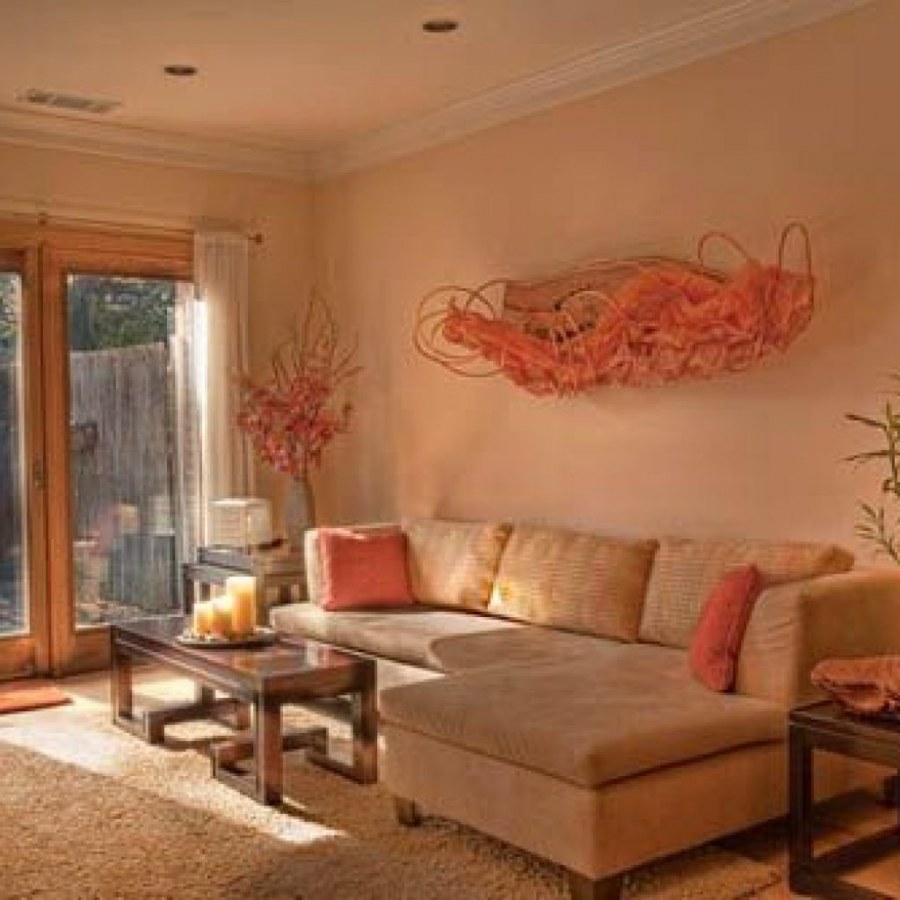 Персиковые стены в интерьере гостиной