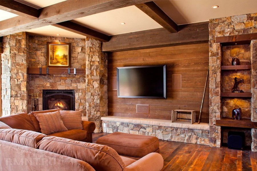 Отделка комнаты камнем и деревом
