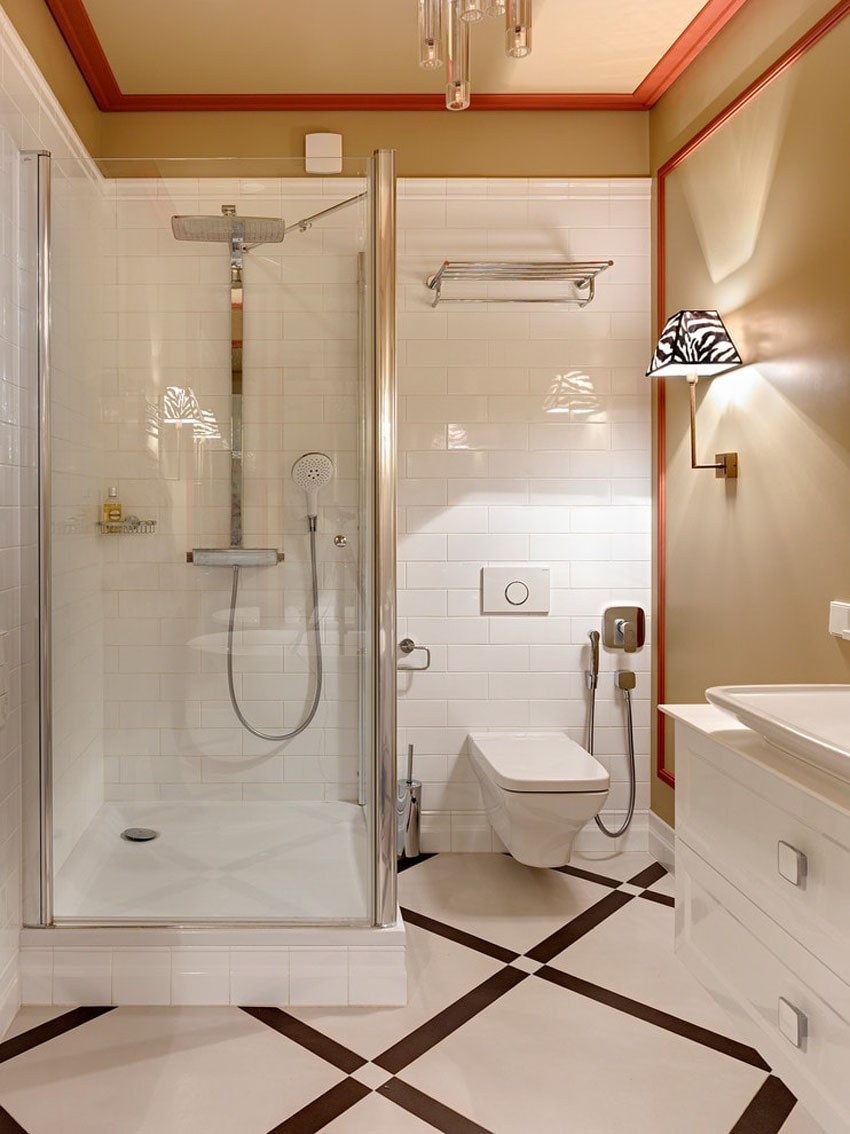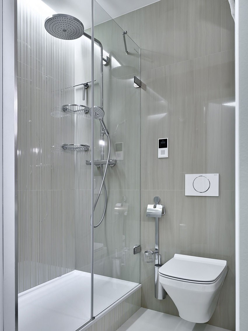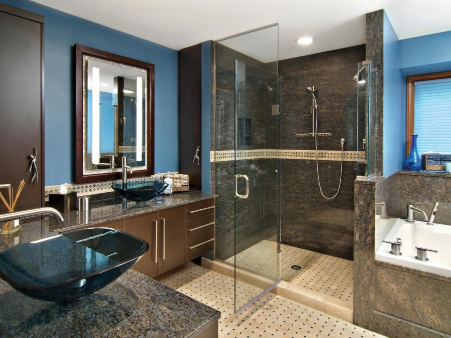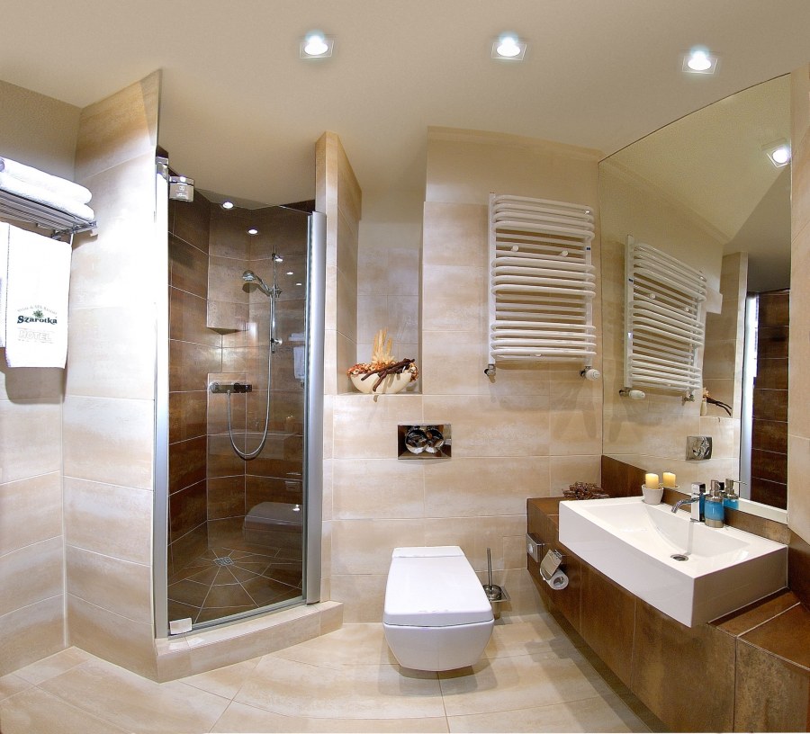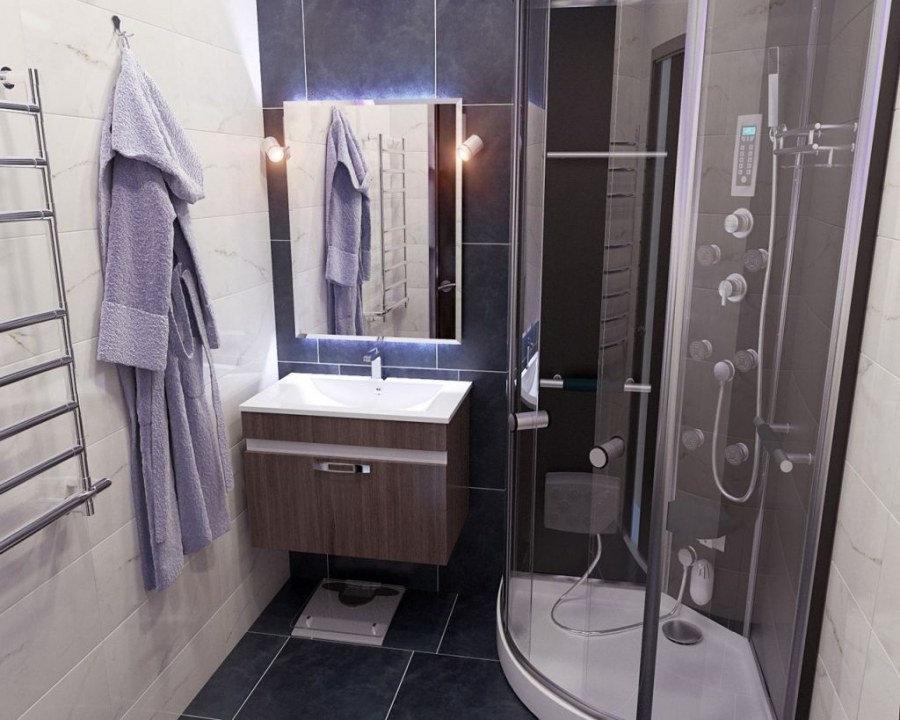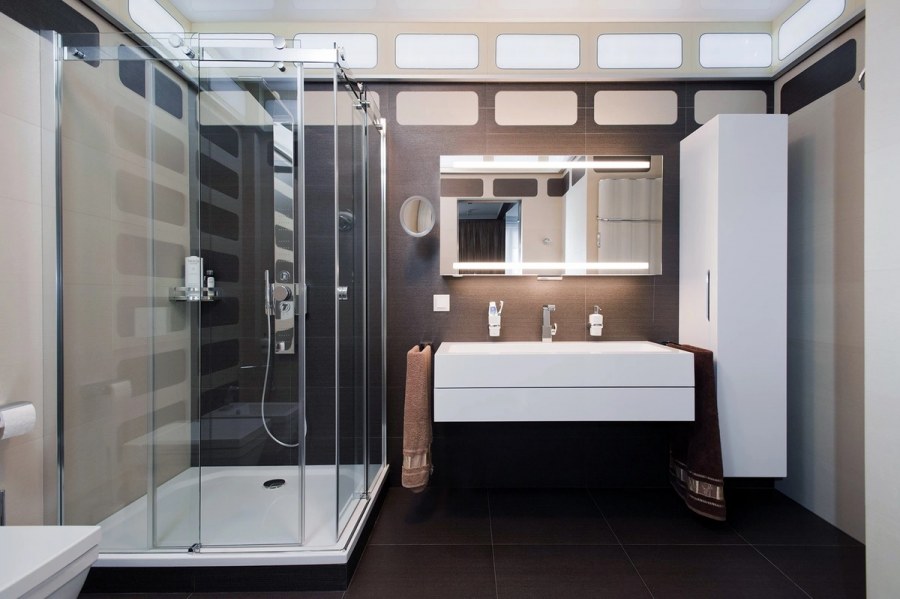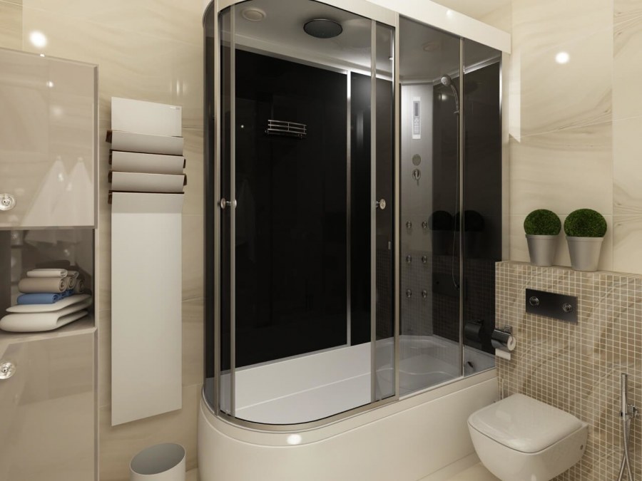 Интерьер ванной комнаты с душевой кабиной и ванной