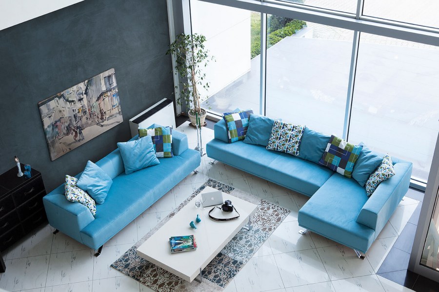 Диван морской волны в интерьере гостиной