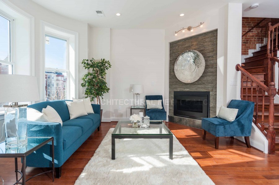 Гостиная с синим диваном