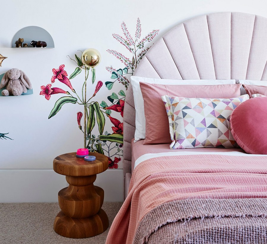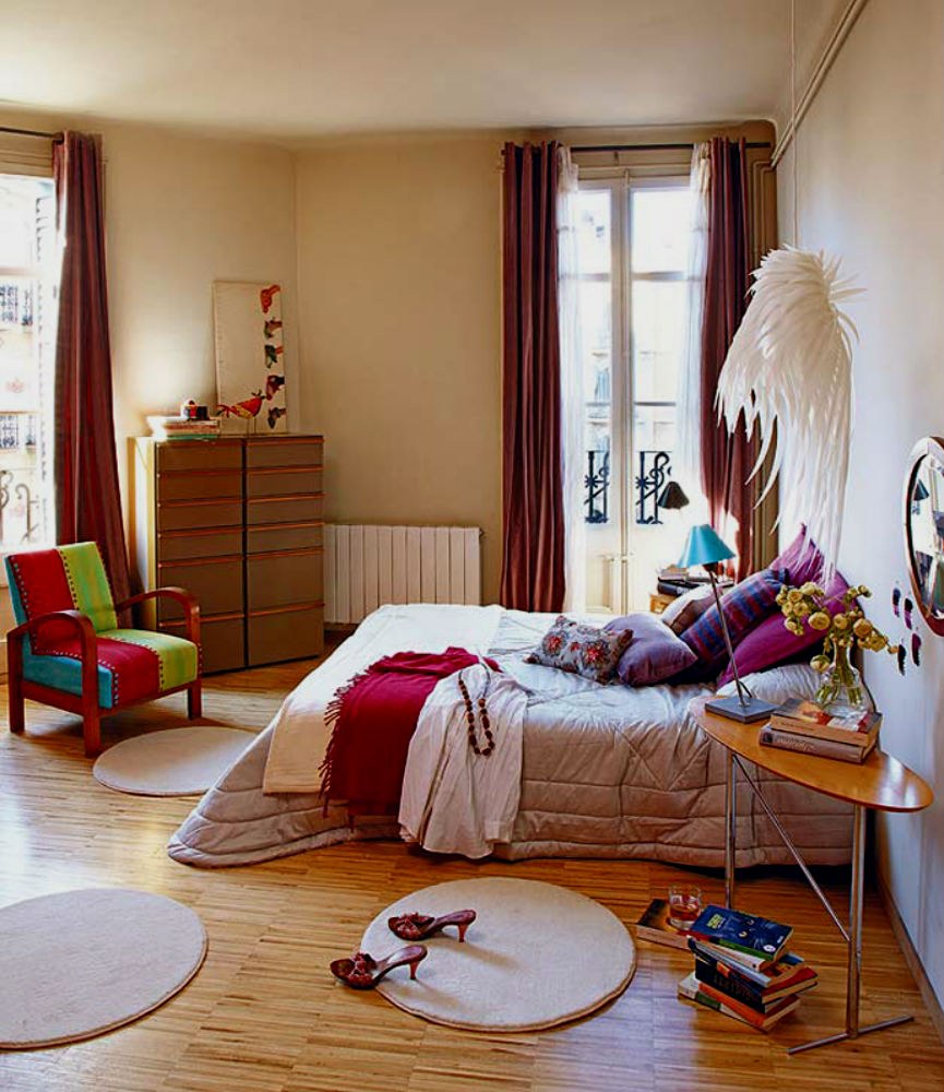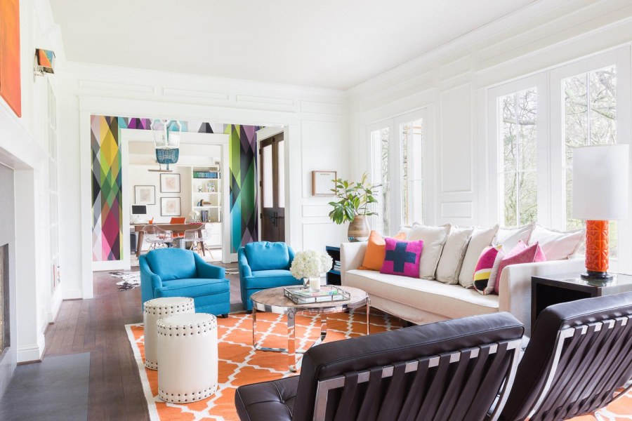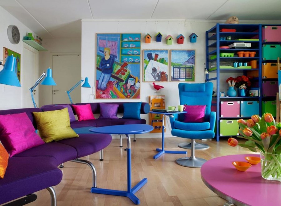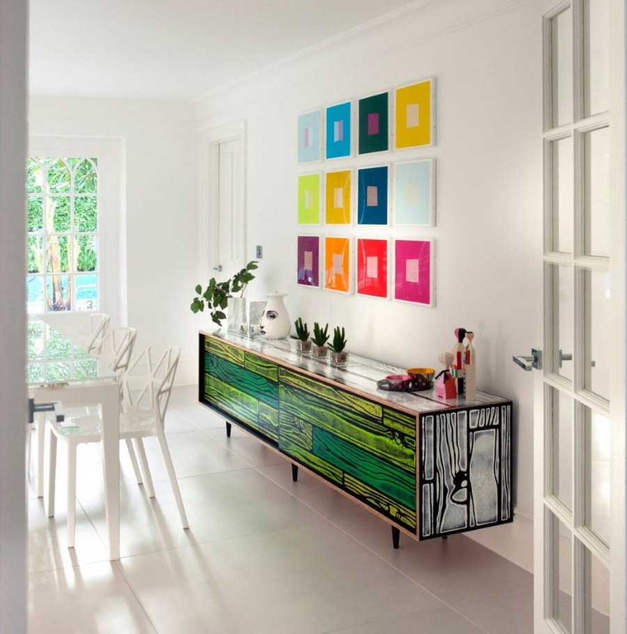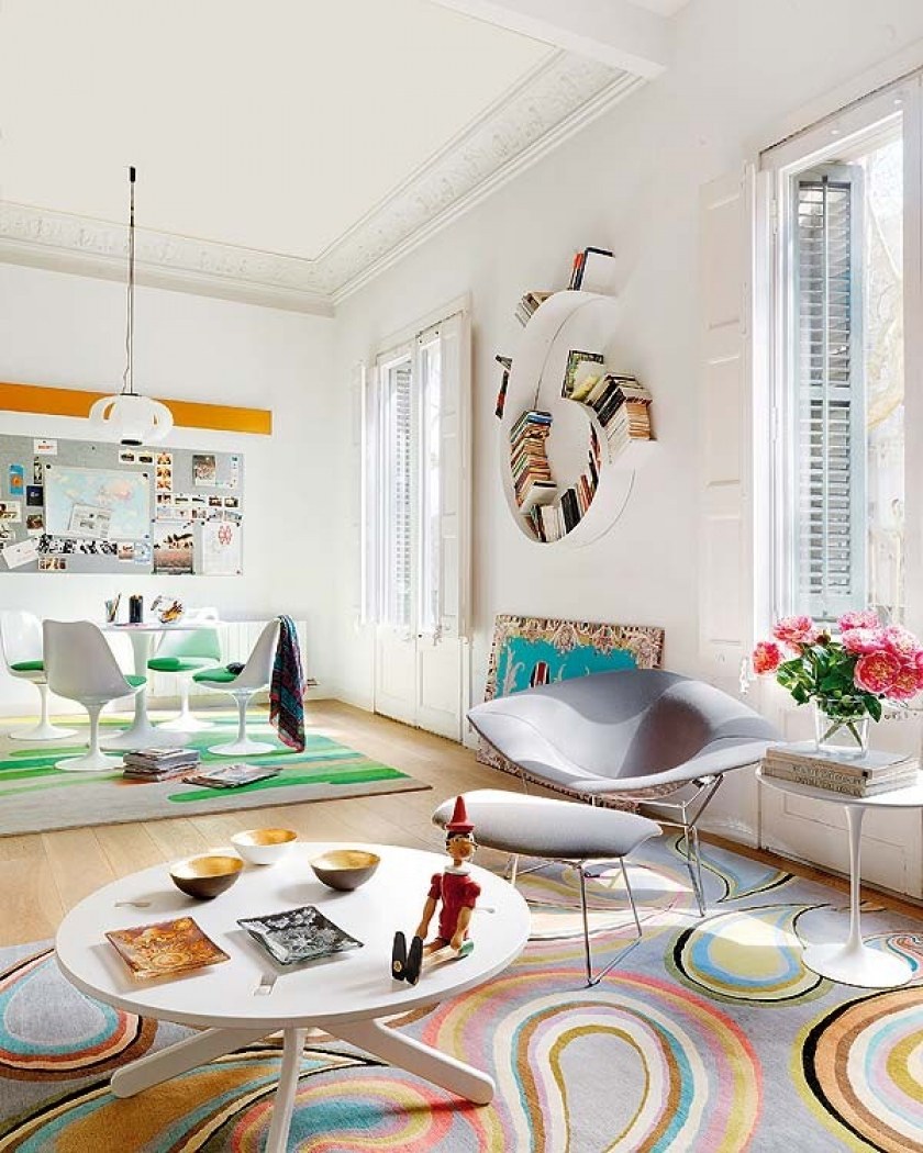 В белой комнате цветной деревянный стол в интерьере Фьюжн