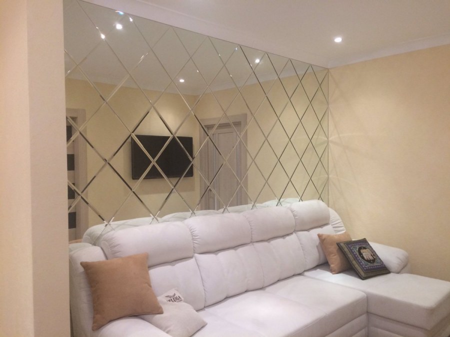 Зеркальная плитка в гостиной над диваном