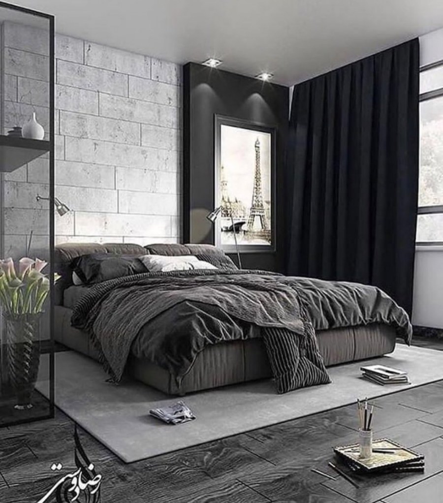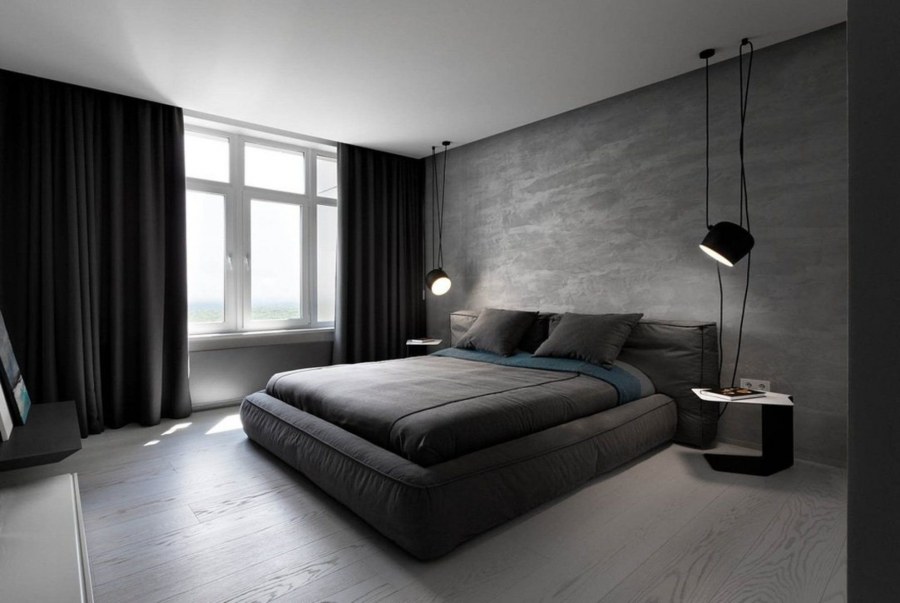 Монохромный интерьер спальни в темных тонах