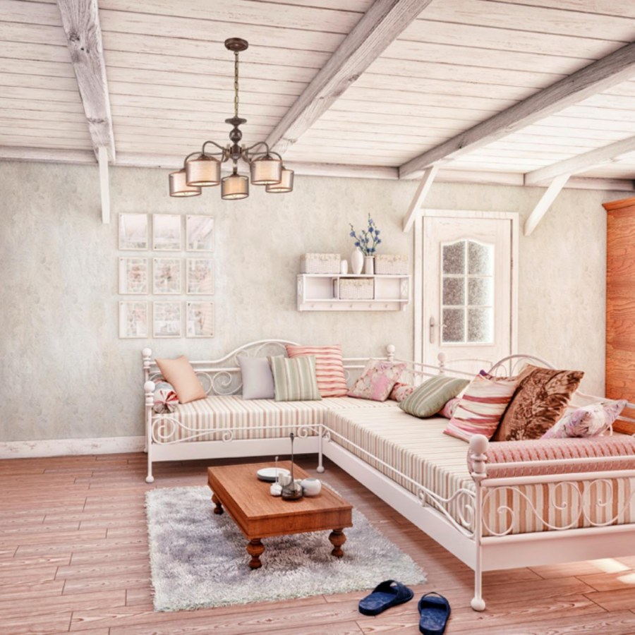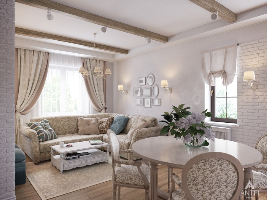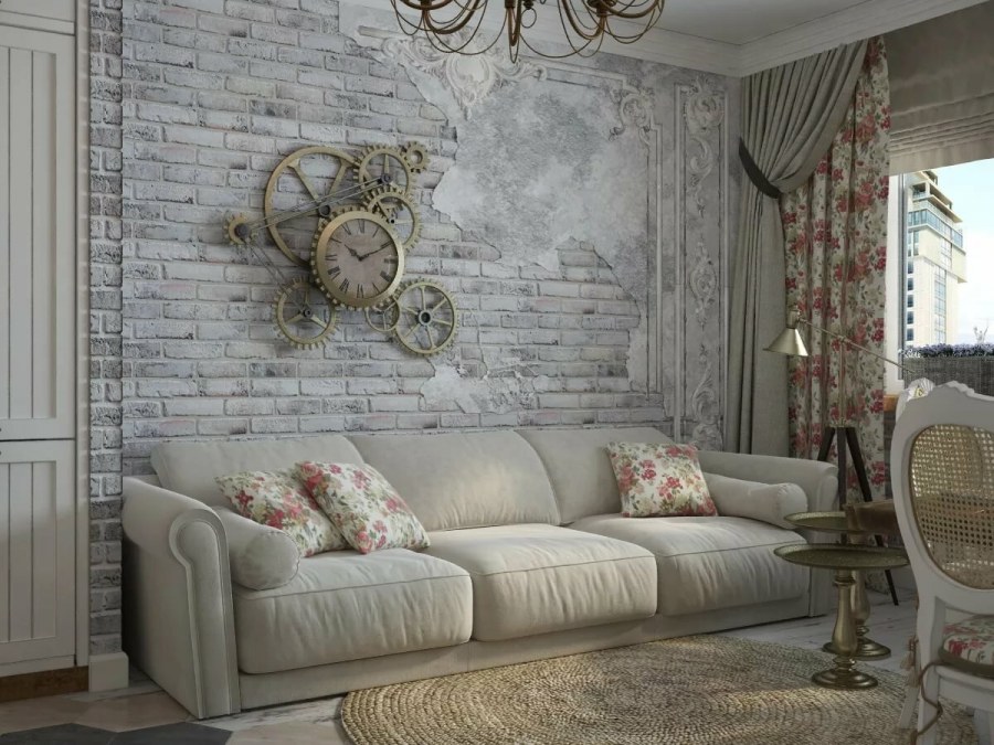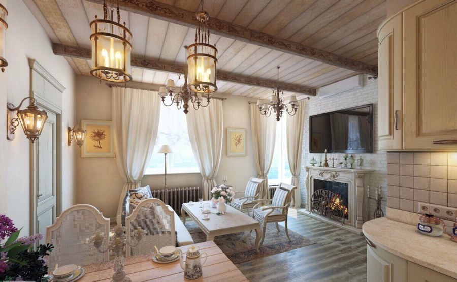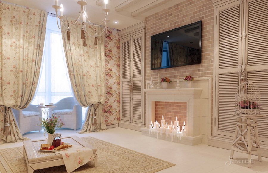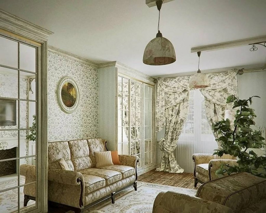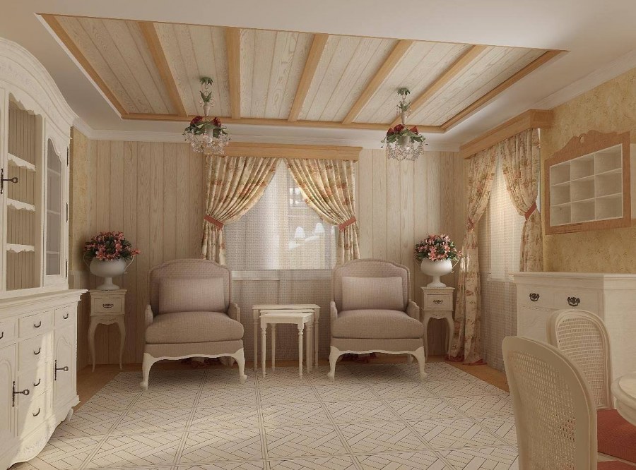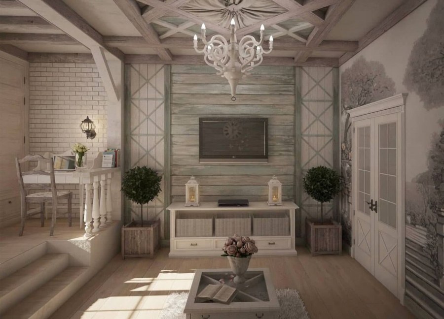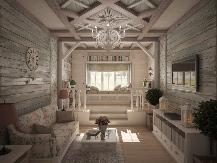 Гостиная в стиле Прованс в деревянном доме с обоями