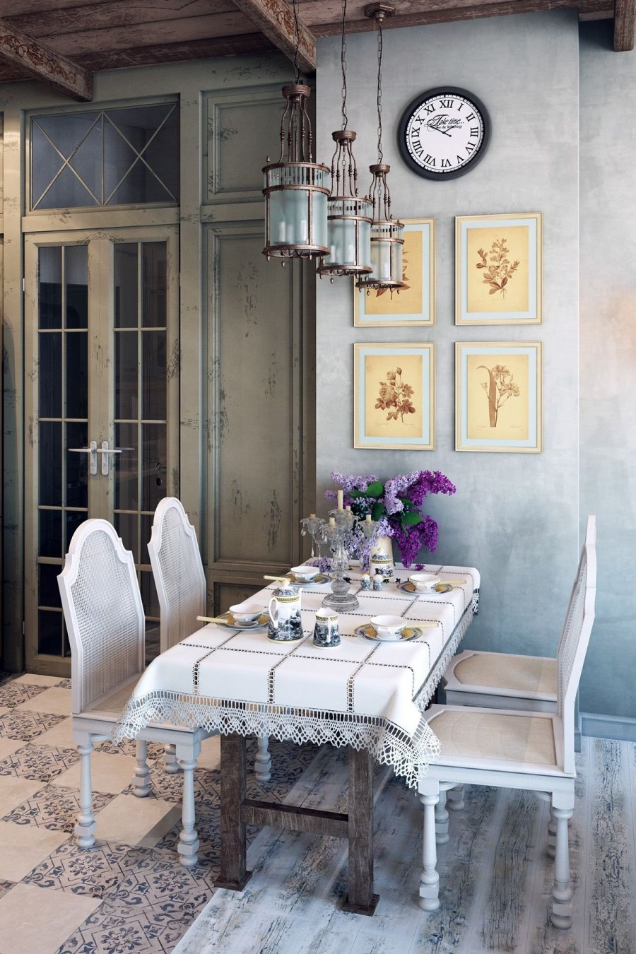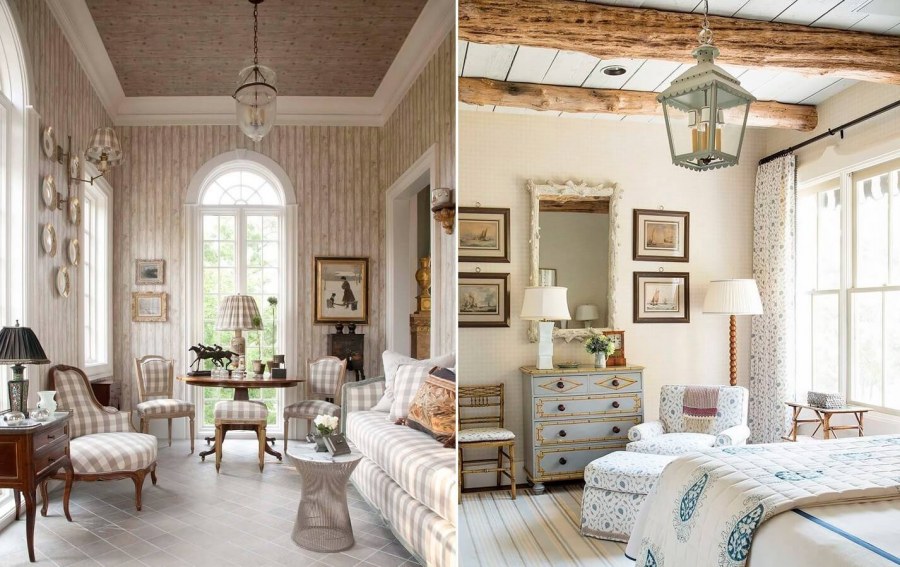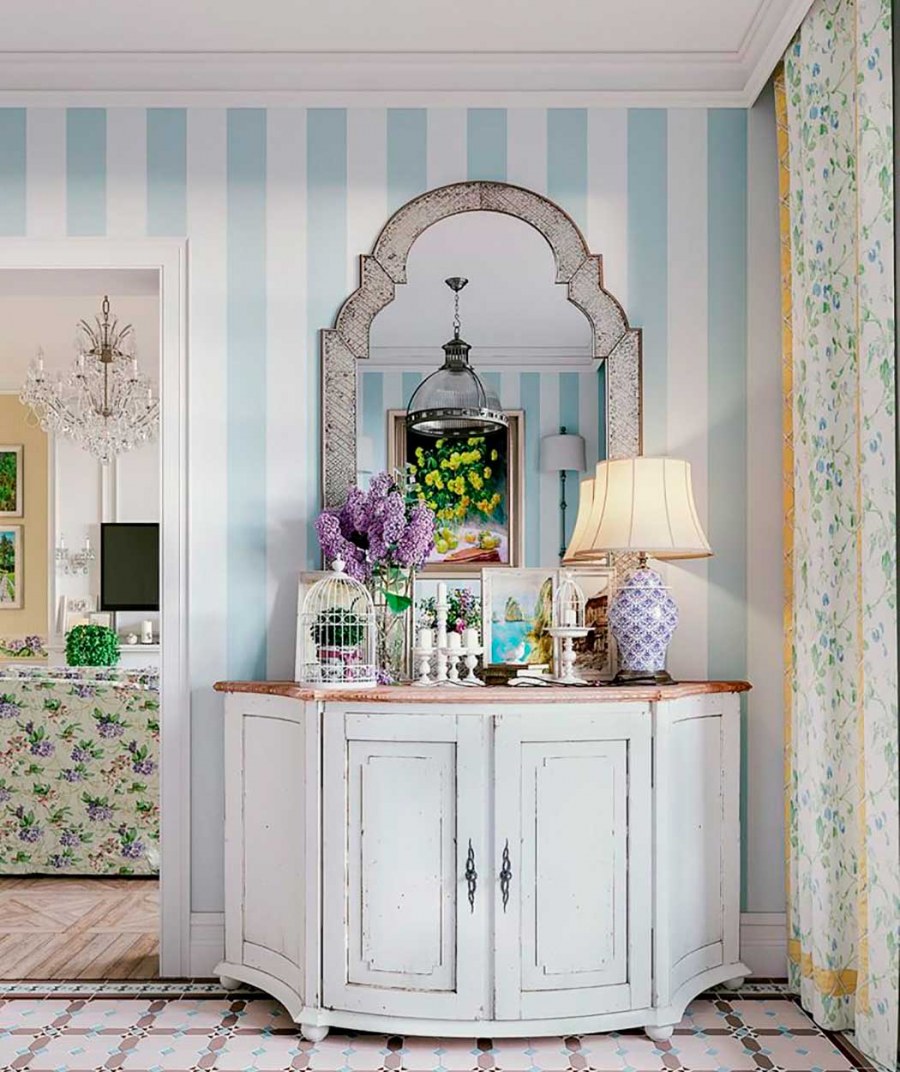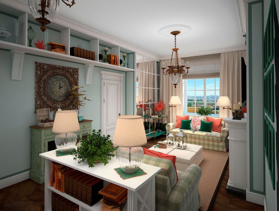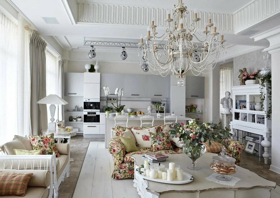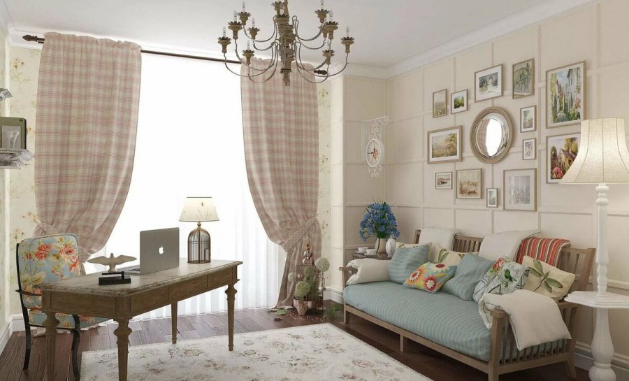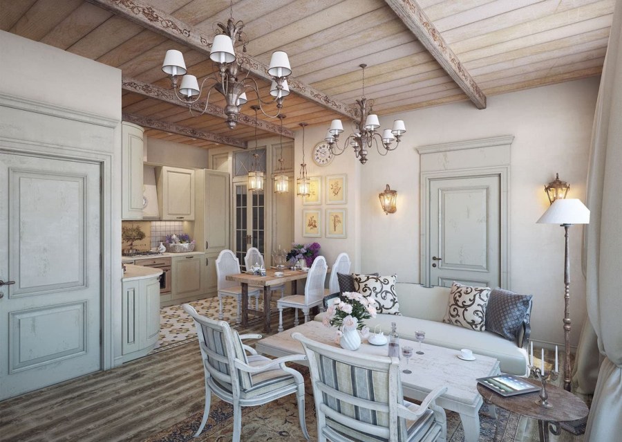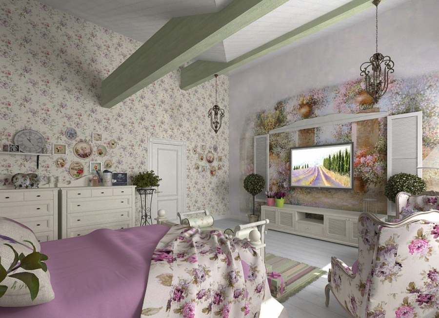 Гостиная в стиле Прованс в деревянном доме с обоями