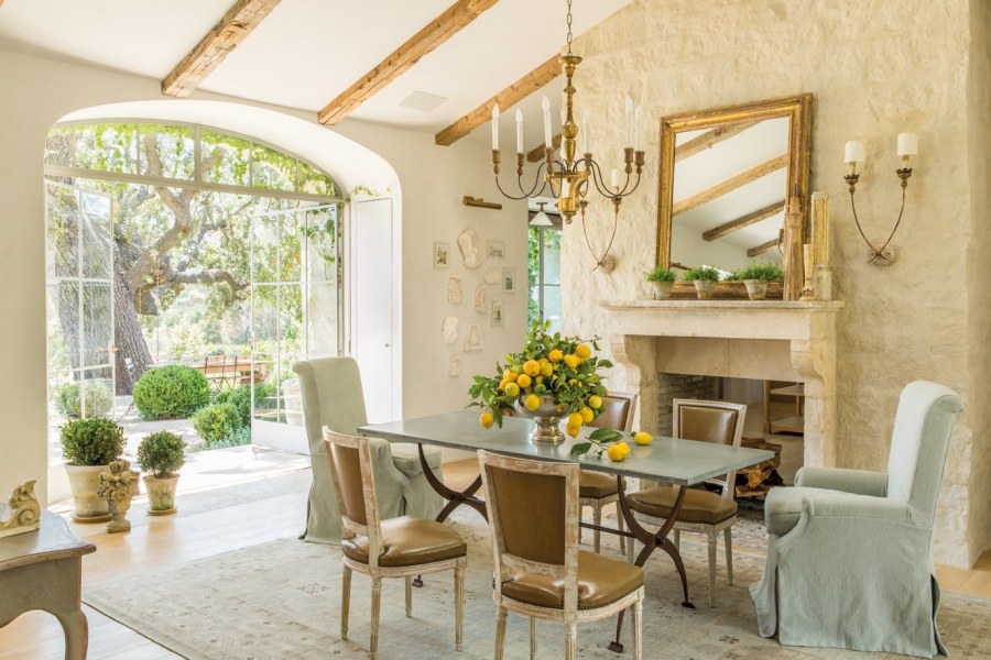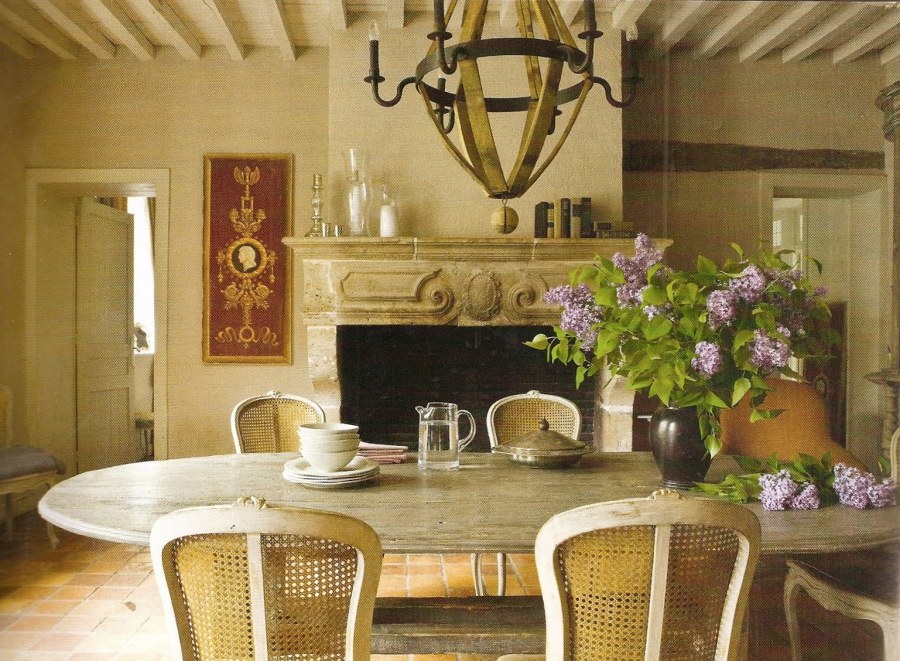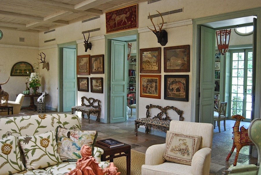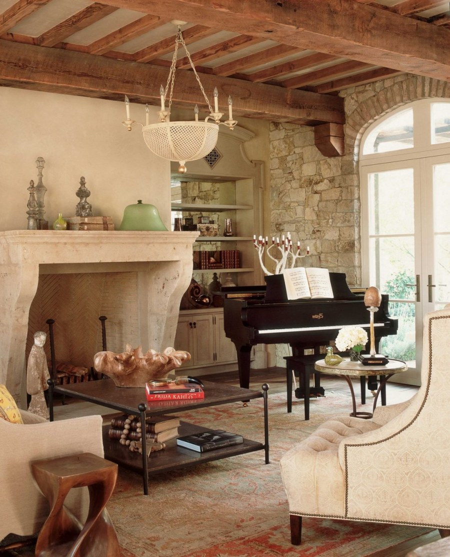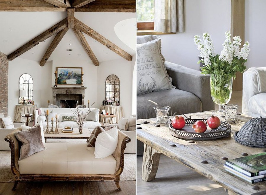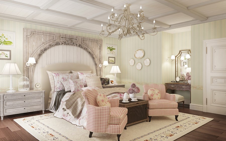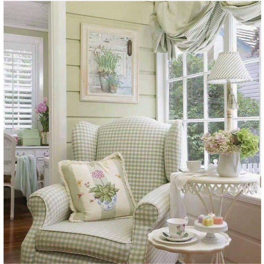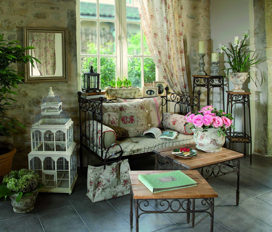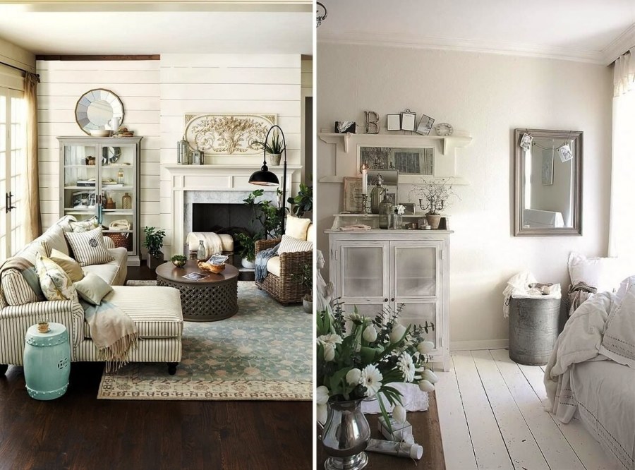 Гостиная в стиле Прованс в деревянном доме с обоями