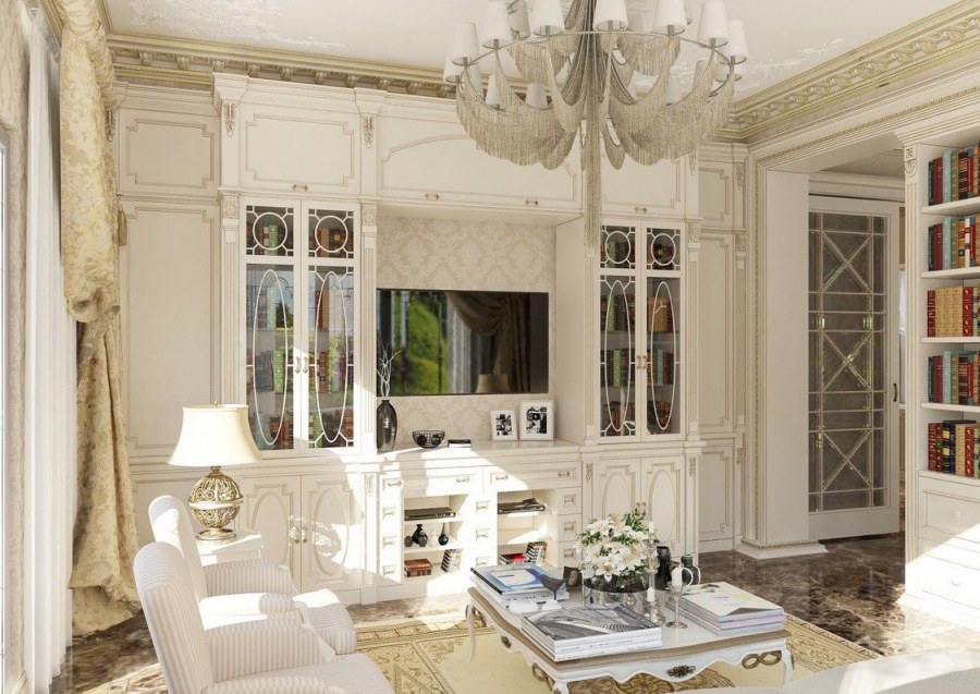 Белый классический интерьер в гостиной