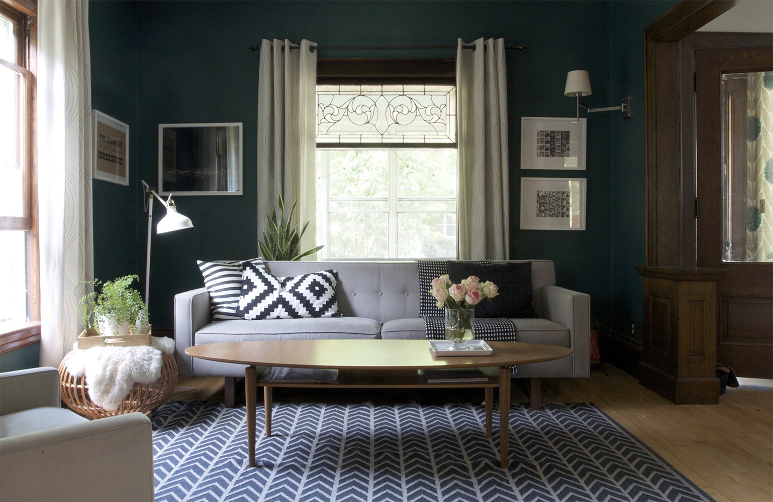 Серый диван зеленые шторы