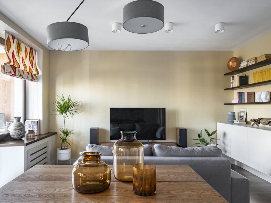 Яркие обои в гостиной брежневки в интерьере (73 фото)