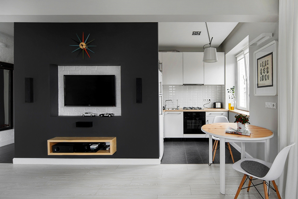 Гостиная стала сердцем квартиры, где функциональность гармонично сочетается с эстетикой. Мебель подбиралась с учётом масштабов помещения — компактный диван с подлокотниками из твёрдого дерева, раскладной стол на четырёх человек и открытые полки, встроенные в нишу. Такой подход позволил избежать ощущения тесноты, сохранив при этом все необходимые зоны. Интерьер двушки без перепланировки стал примером того, как даже в ограниченных условиях можно создать практичное и выразительное пространство.