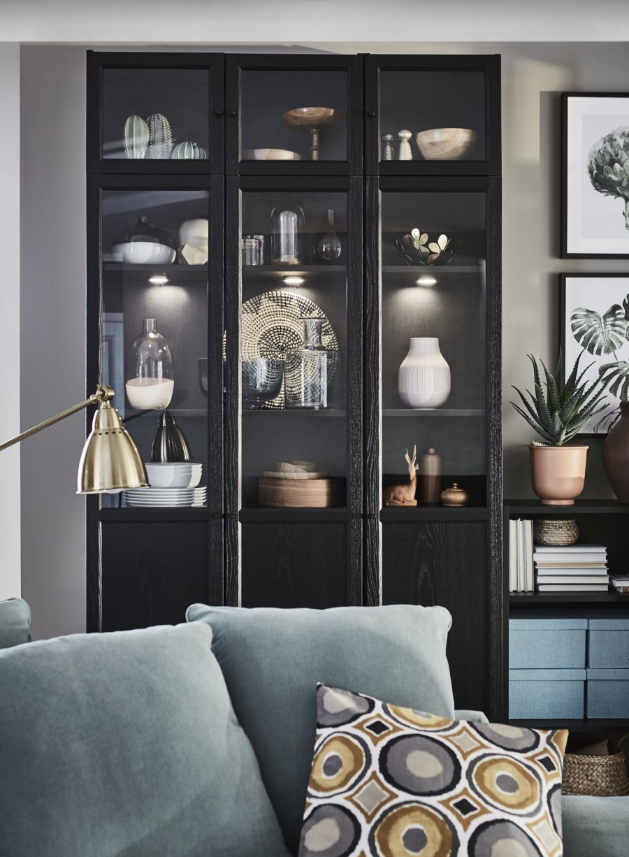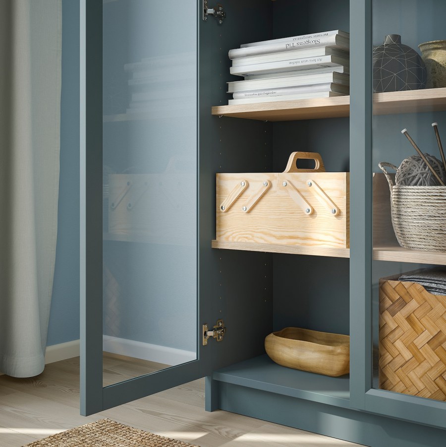 Billy Билли шкаф книжный со стеклянными дверьми, серо-бирюзовый/дубовый