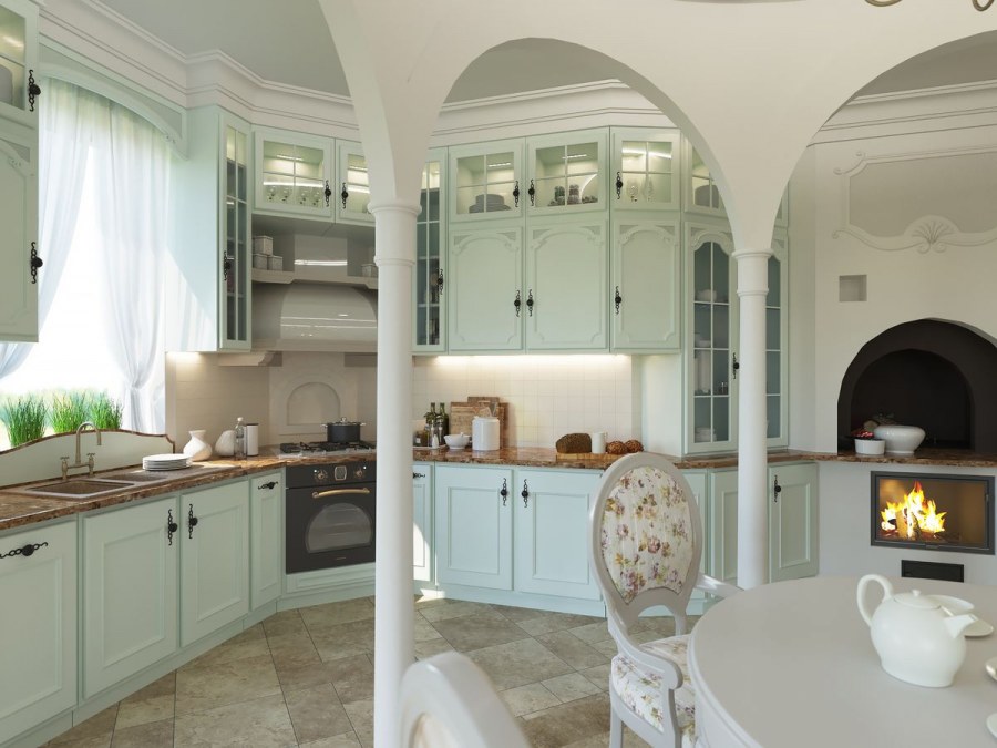 Интерьер кухни в стиле Прованс в доме из клееного бруса