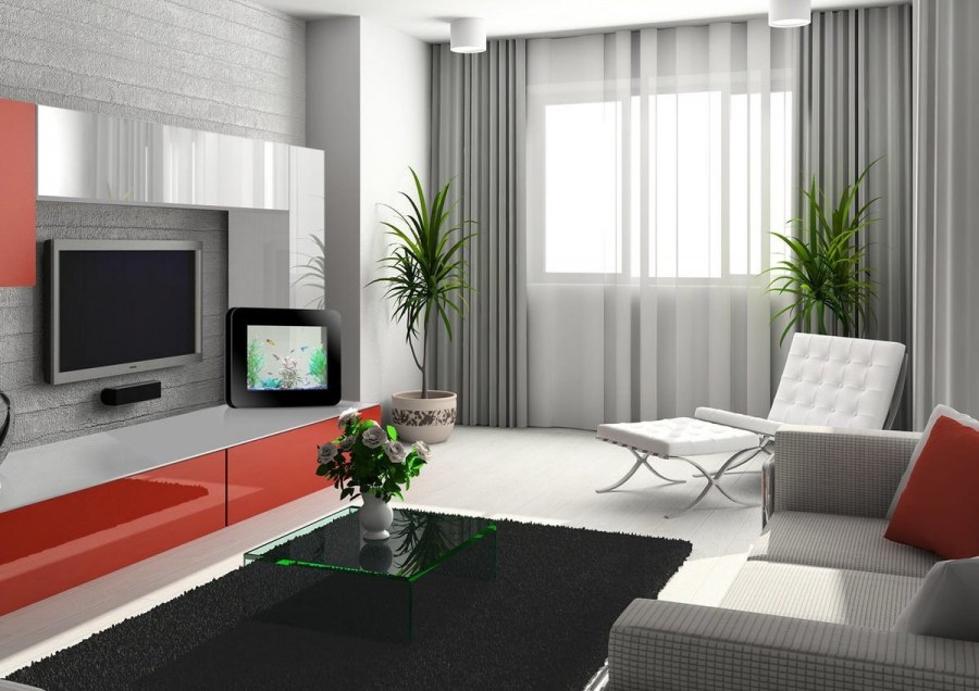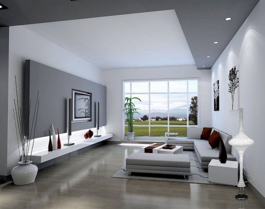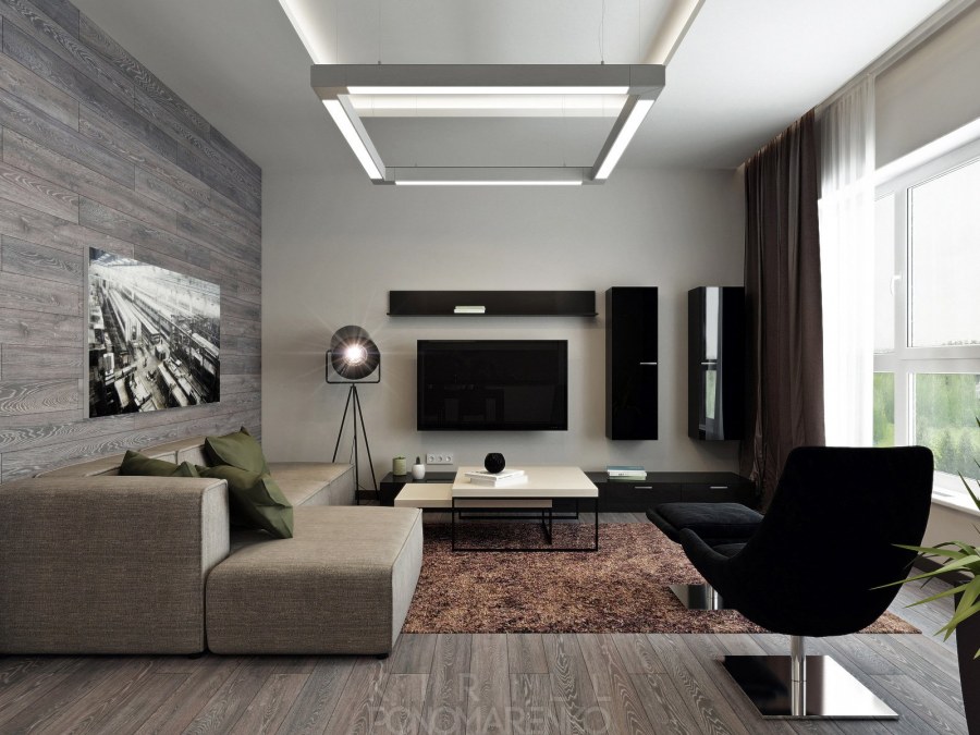 Интерьер гостиной комнаты в современном стиле эконом класса в сером (72 фото)