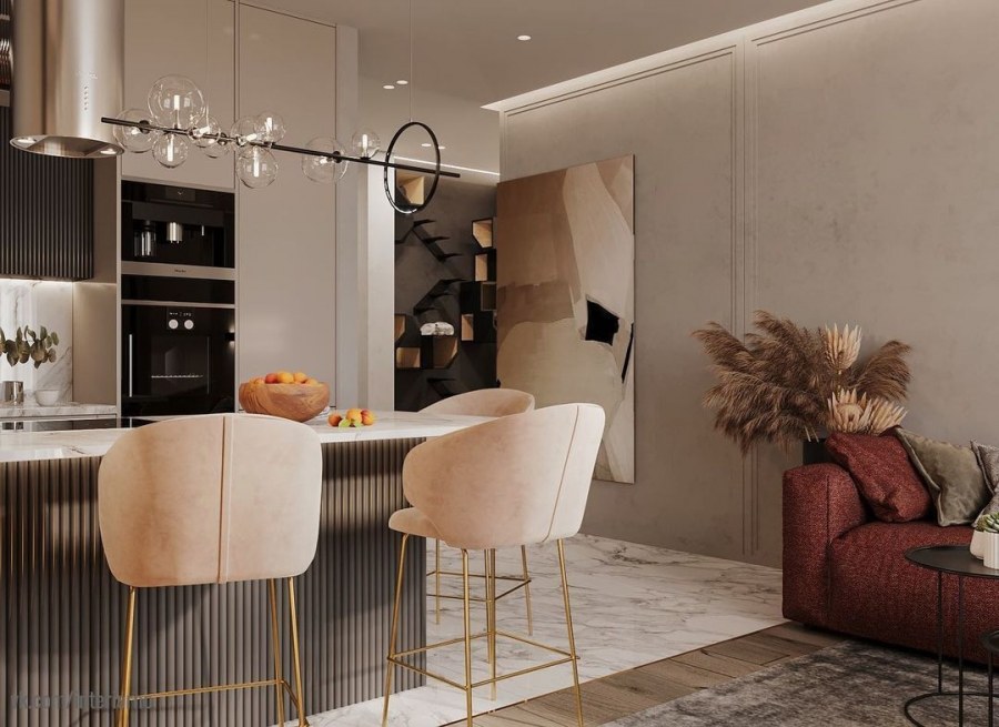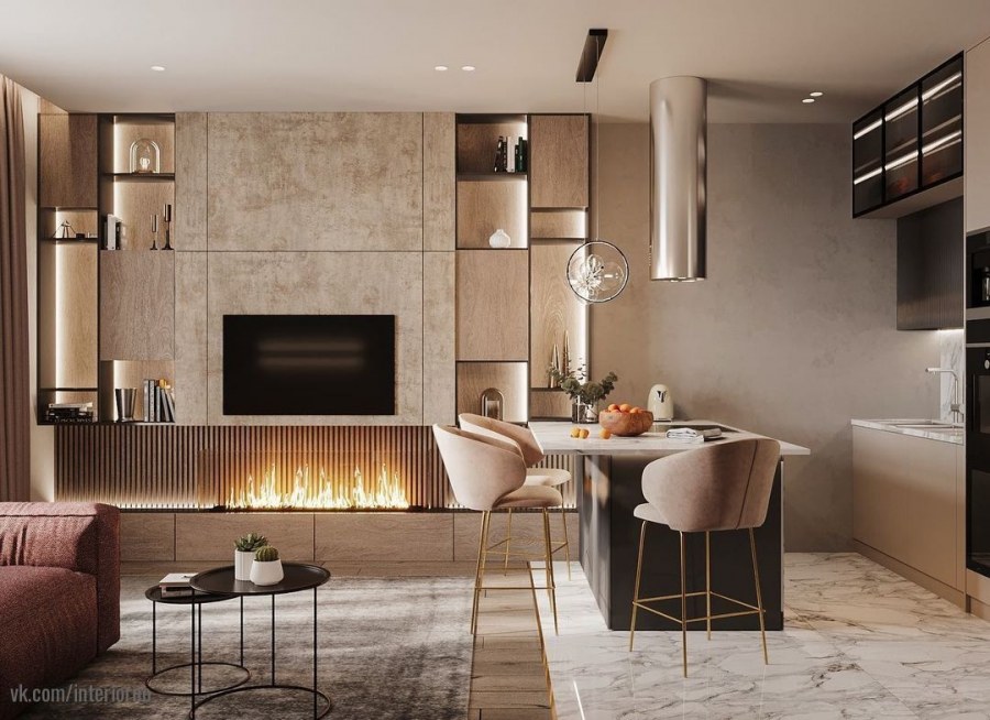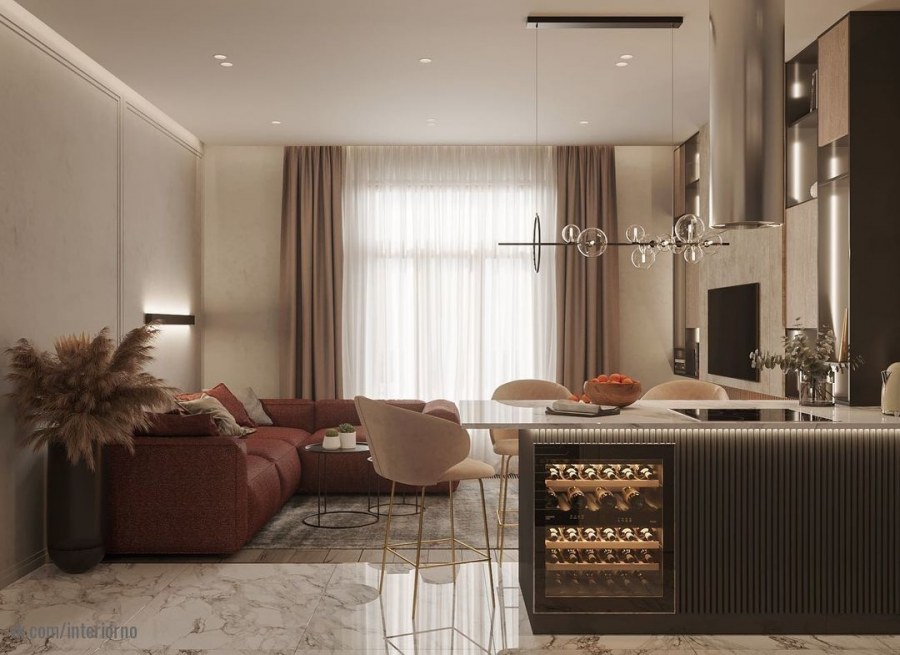 Кухня гостиная в теплых тонах современный стиль