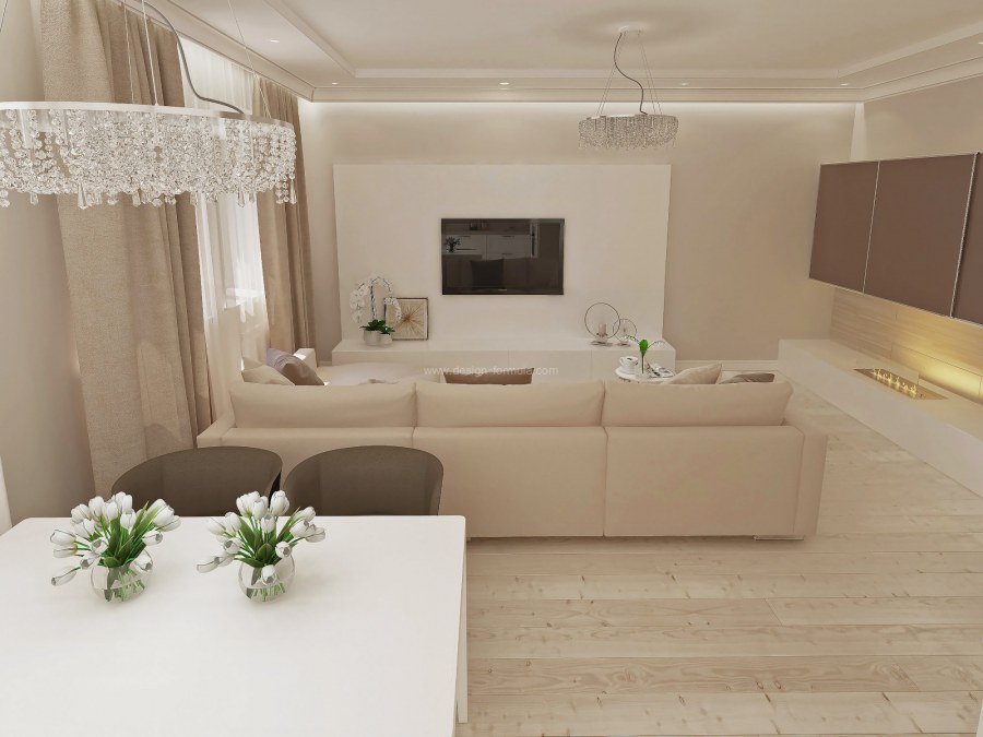 Кухня гостиная в бело бежевых тонах