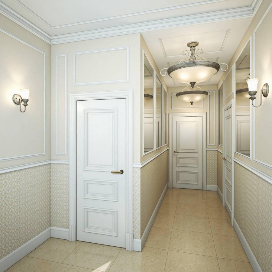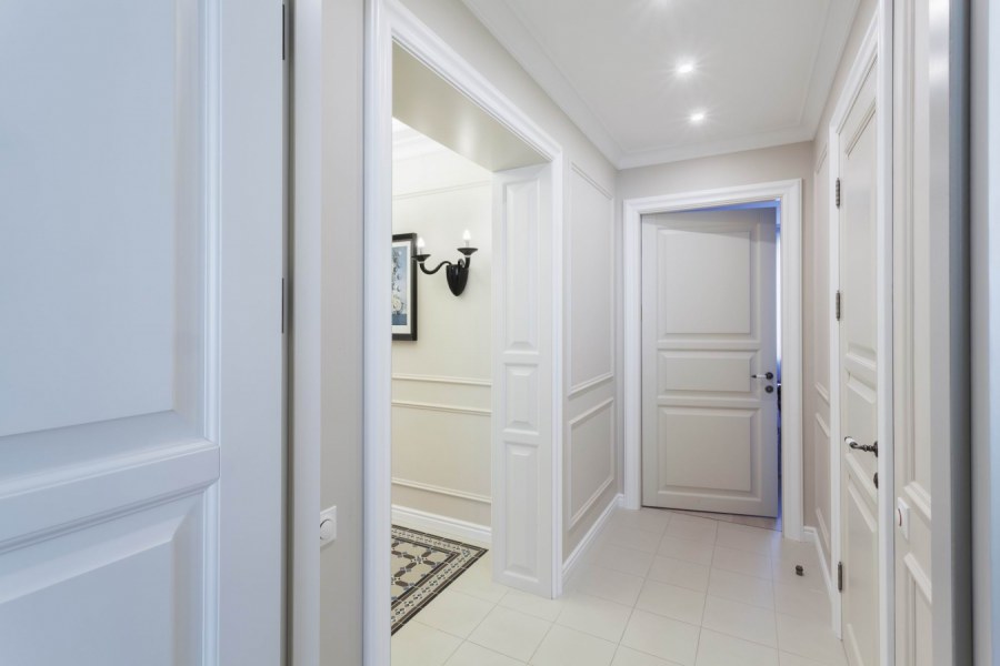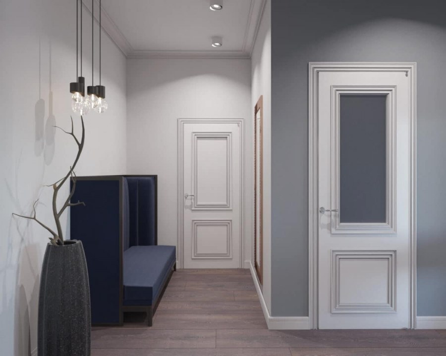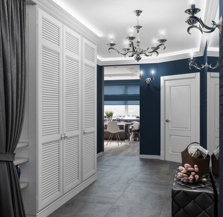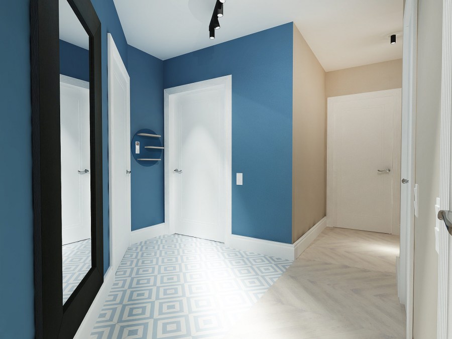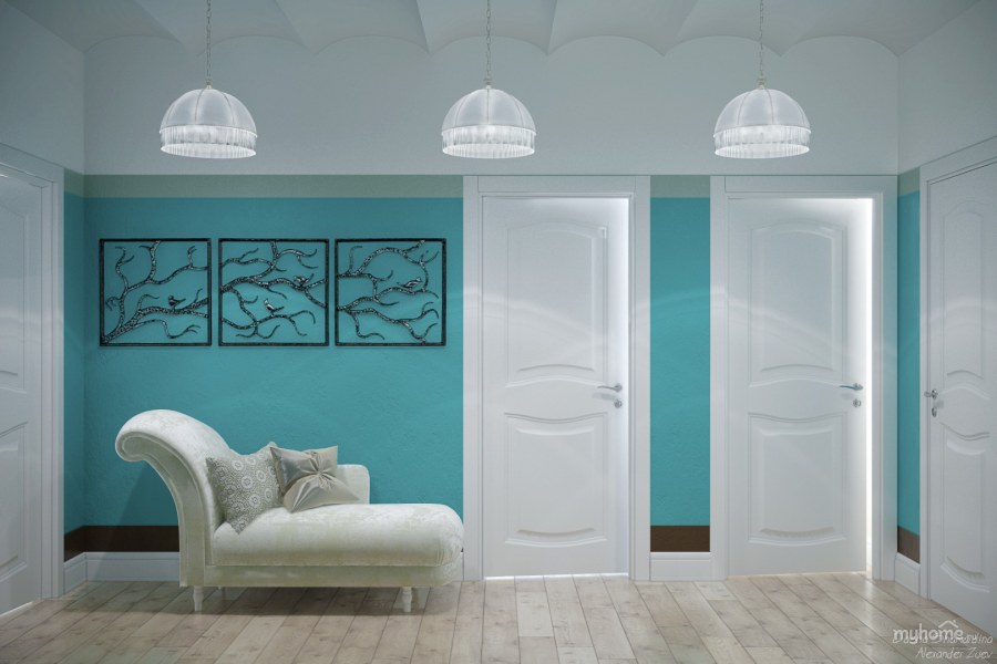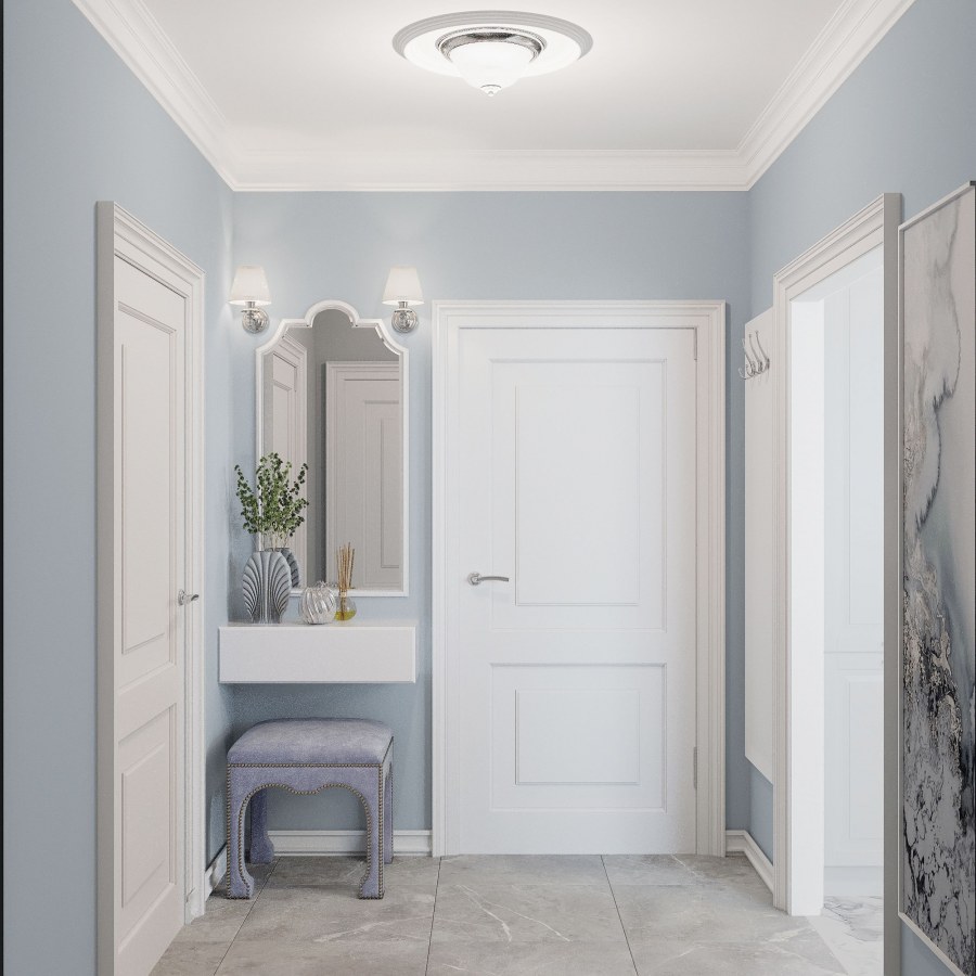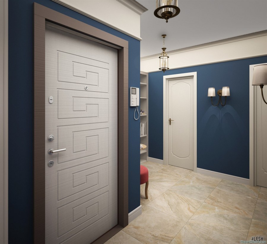 Голубые обои в коридоре с белыми дверями (72 фото)