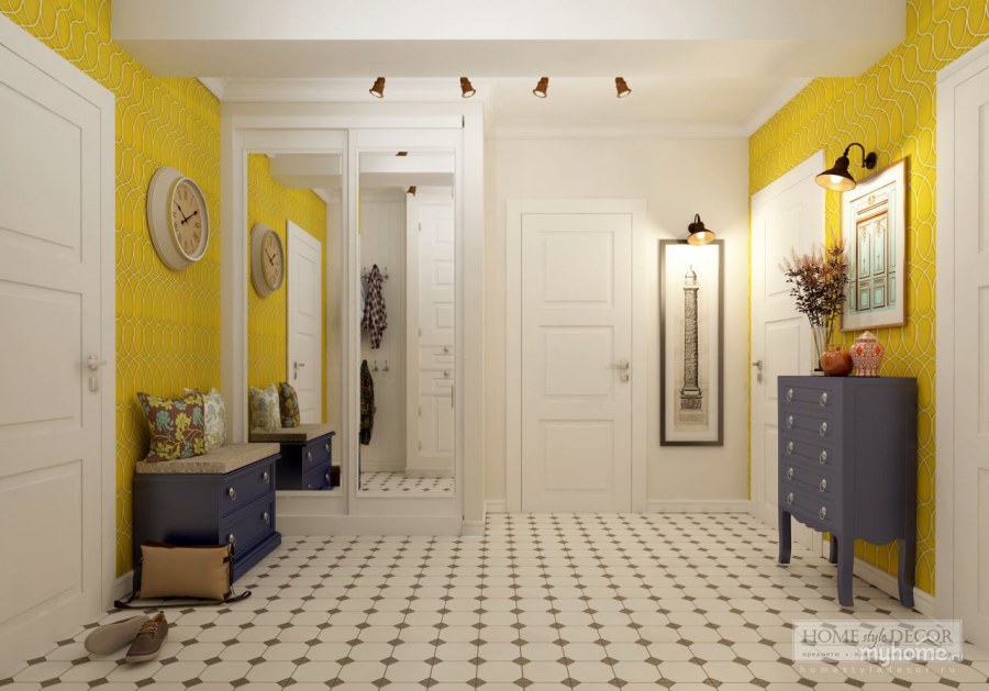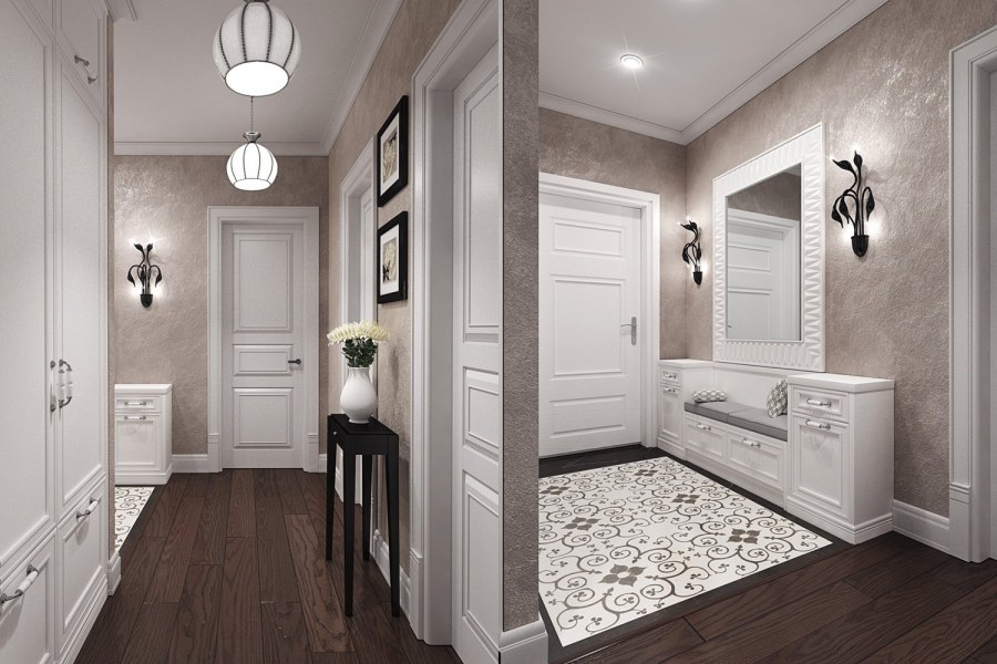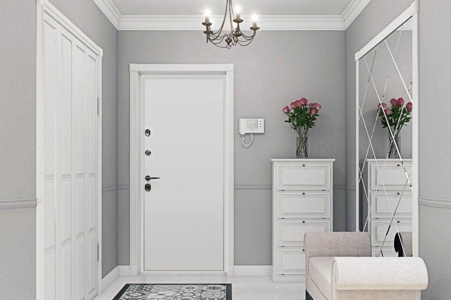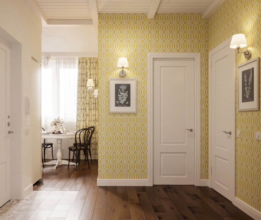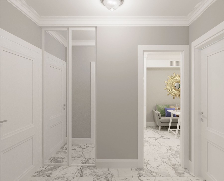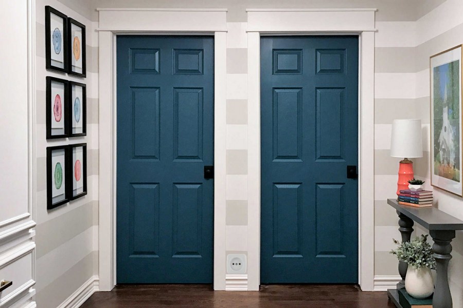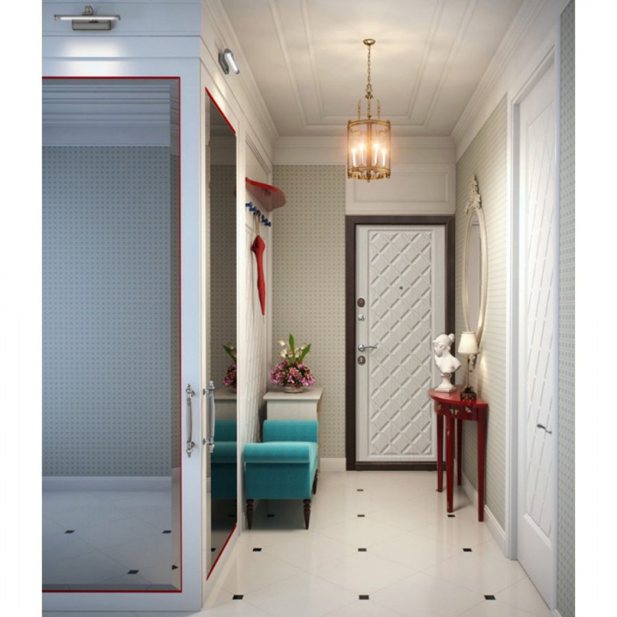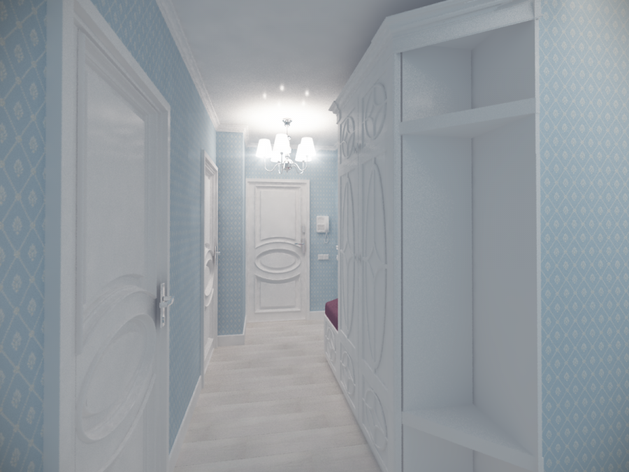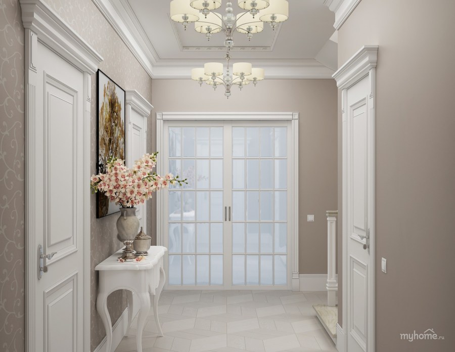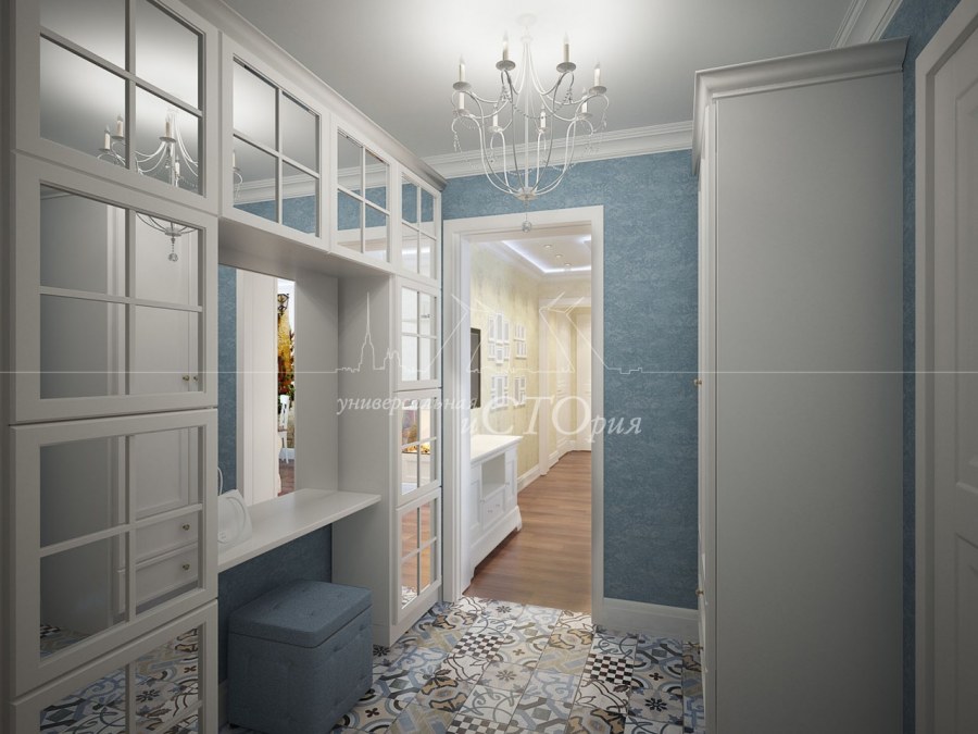 Голубые обои в коридоре с белыми дверями (72 фото)