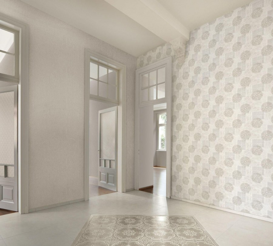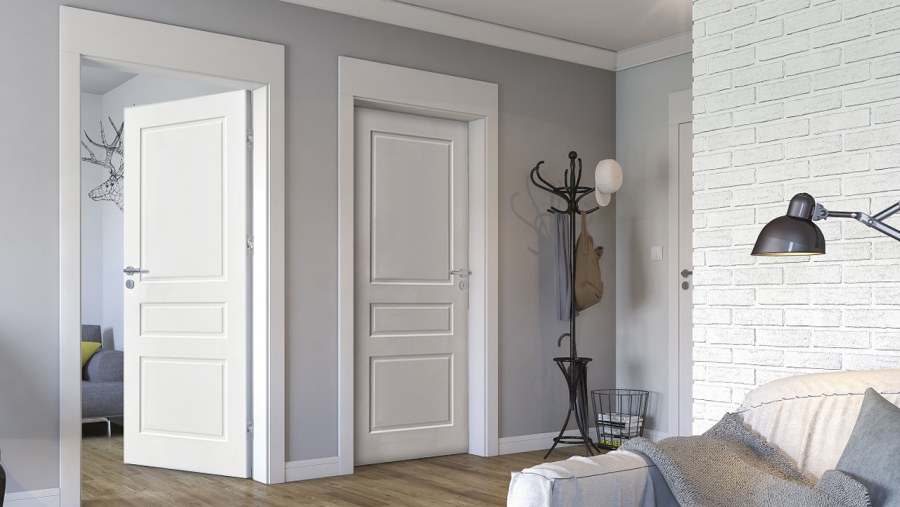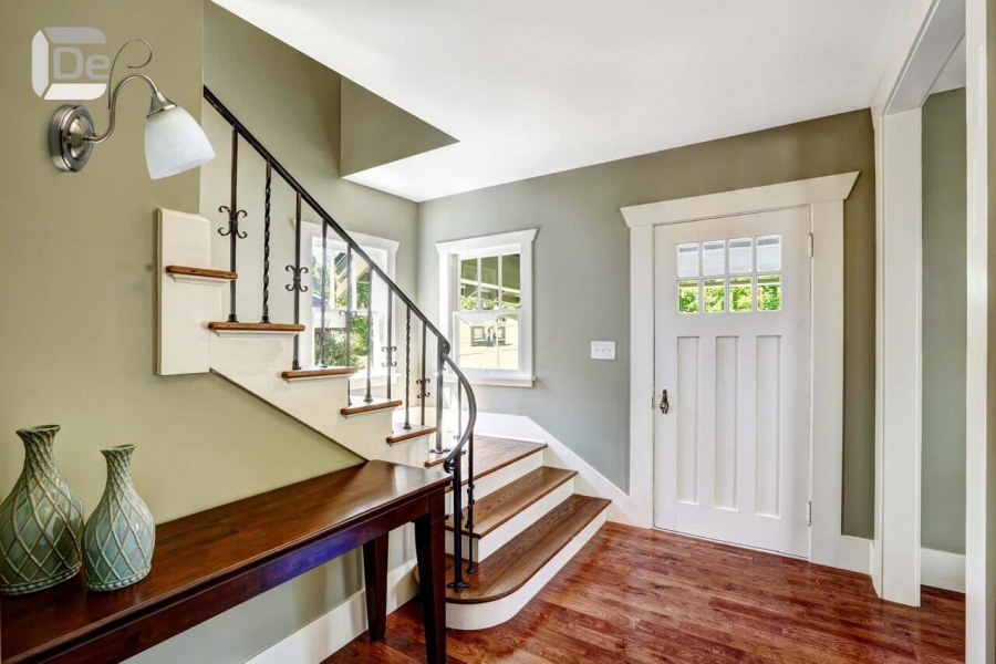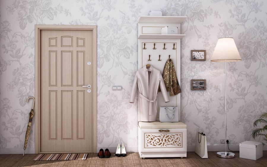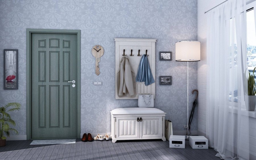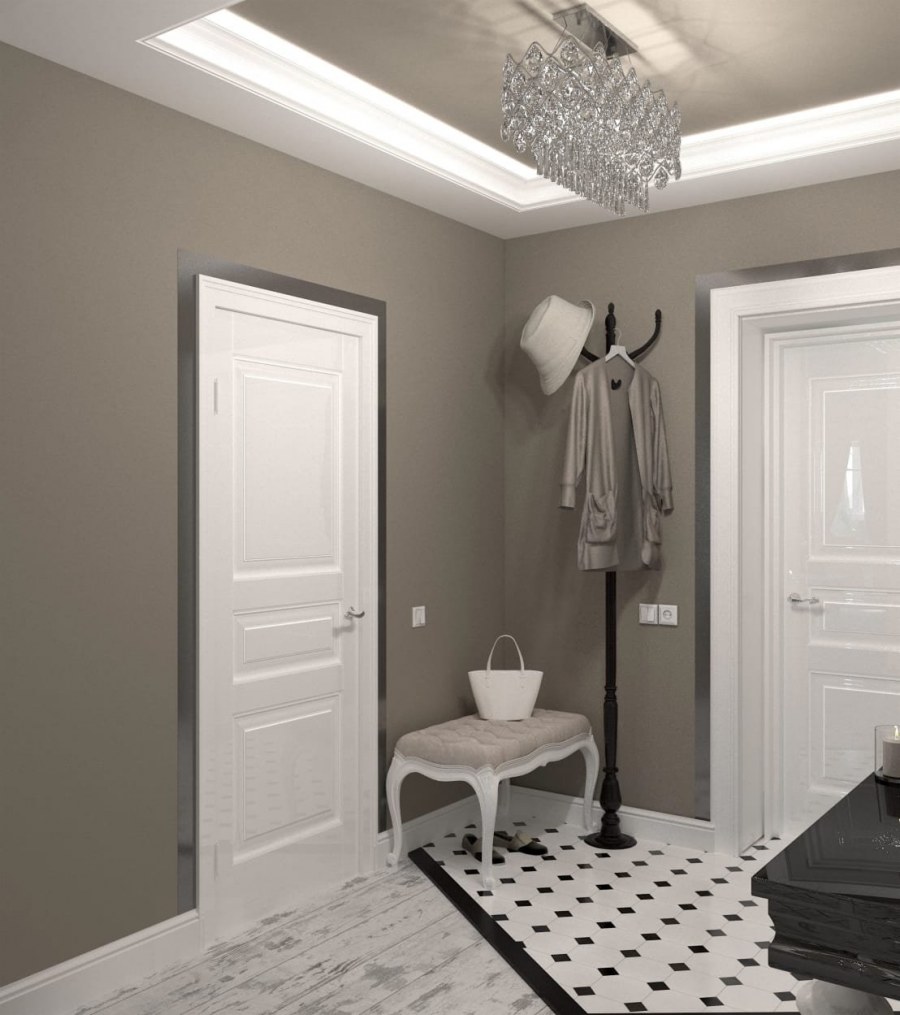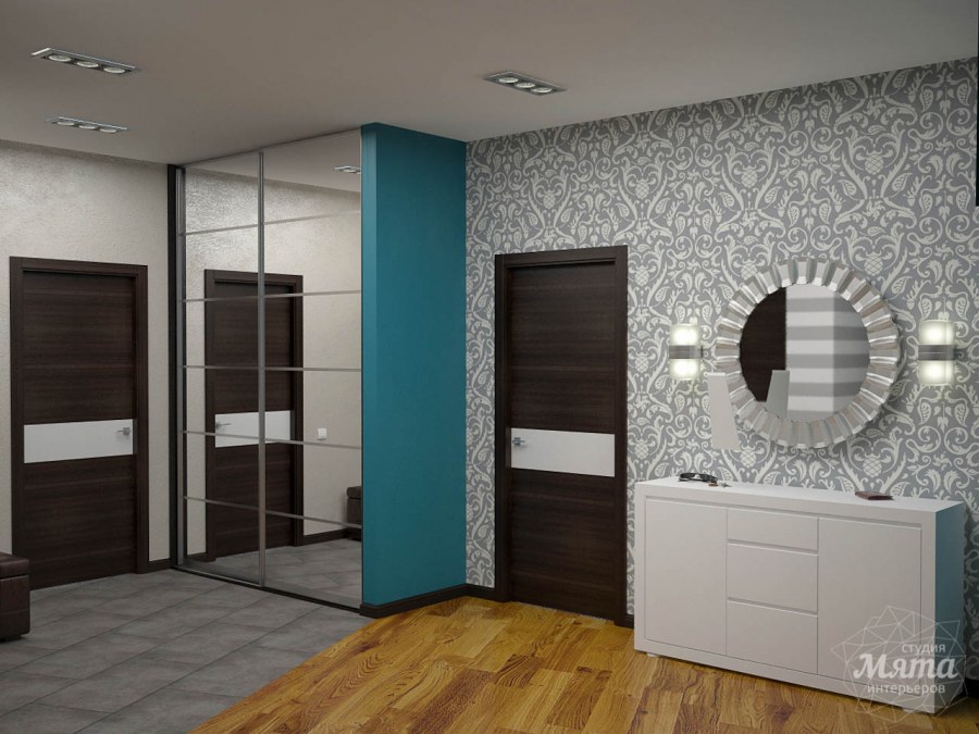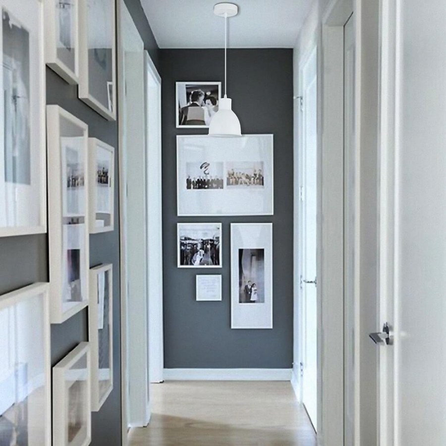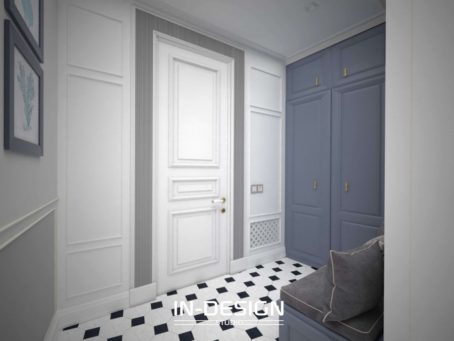 Голубые обои в коридоре с белыми дверями (72 фото)
