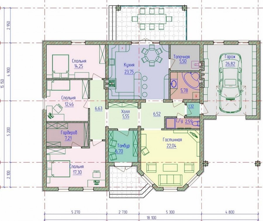 Одноэтажный дом с гаражом 100кв.м планировка