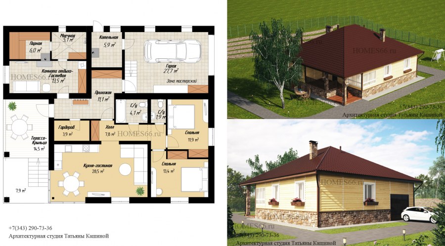 Проекты одноэтажных домов с гаражом и баней
