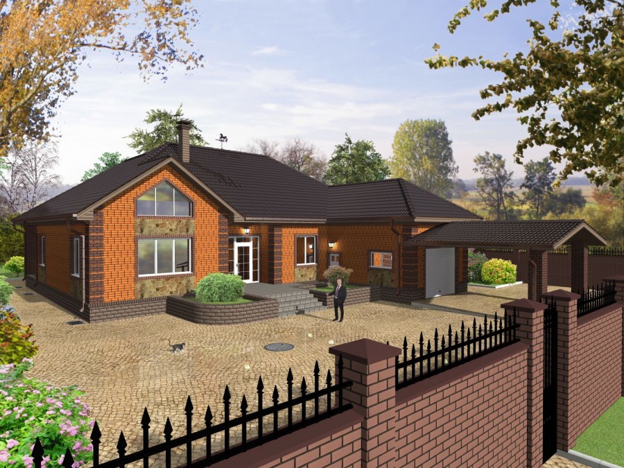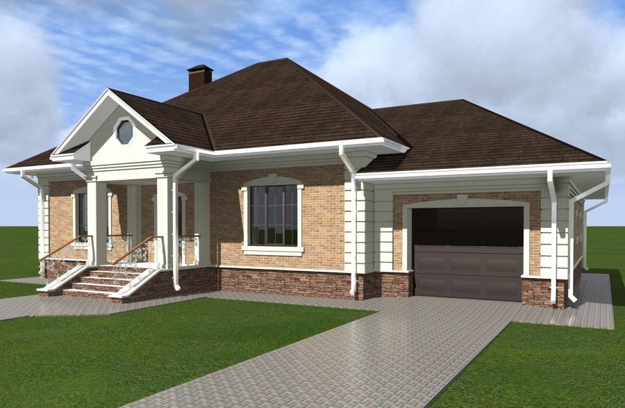 Одноэтажный кирпичный дом с террасой и гаражом